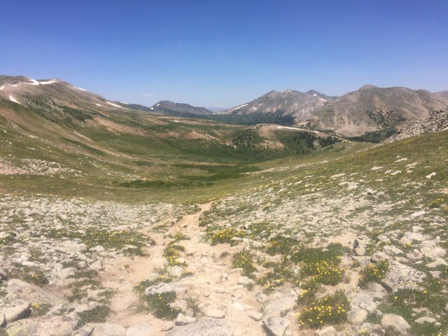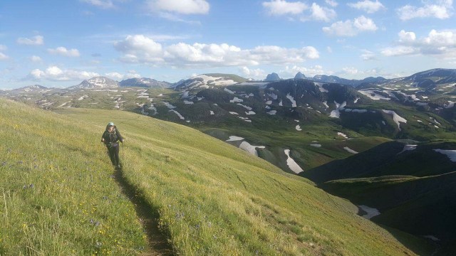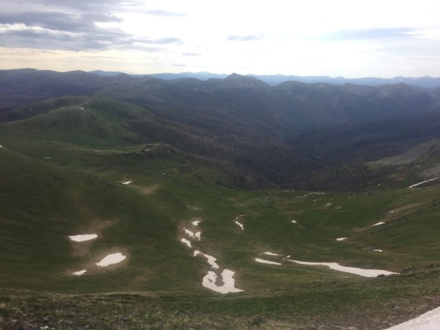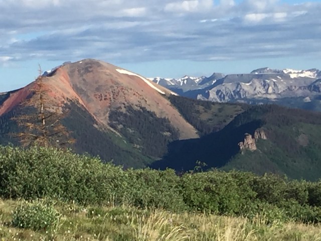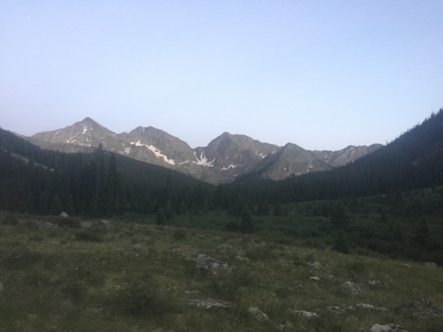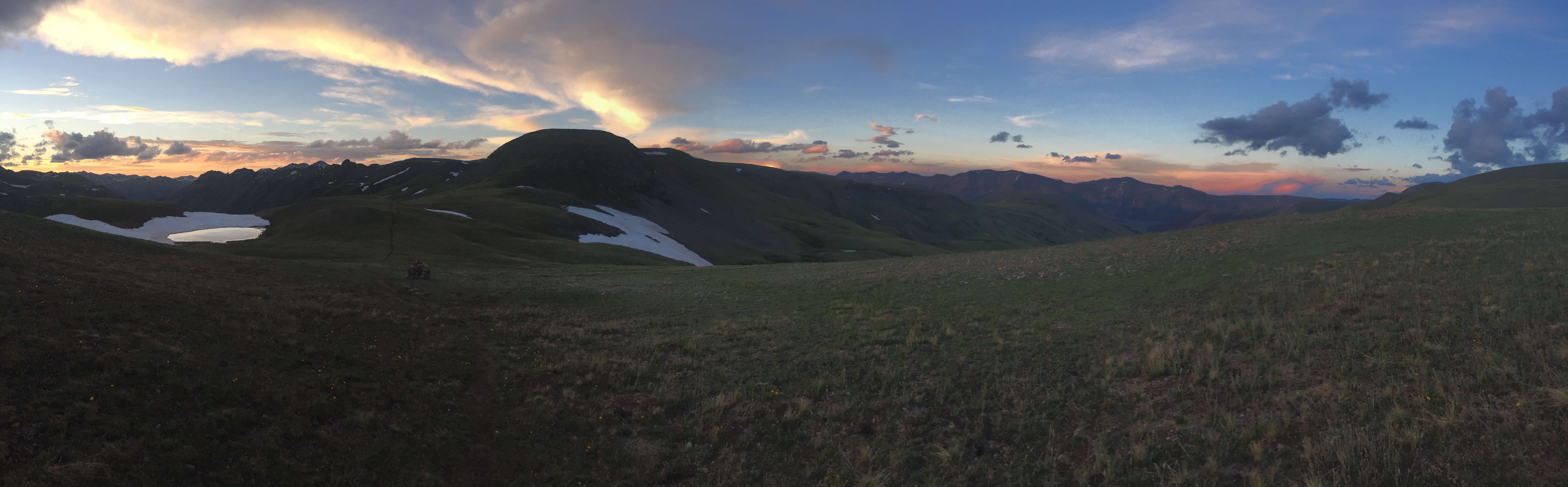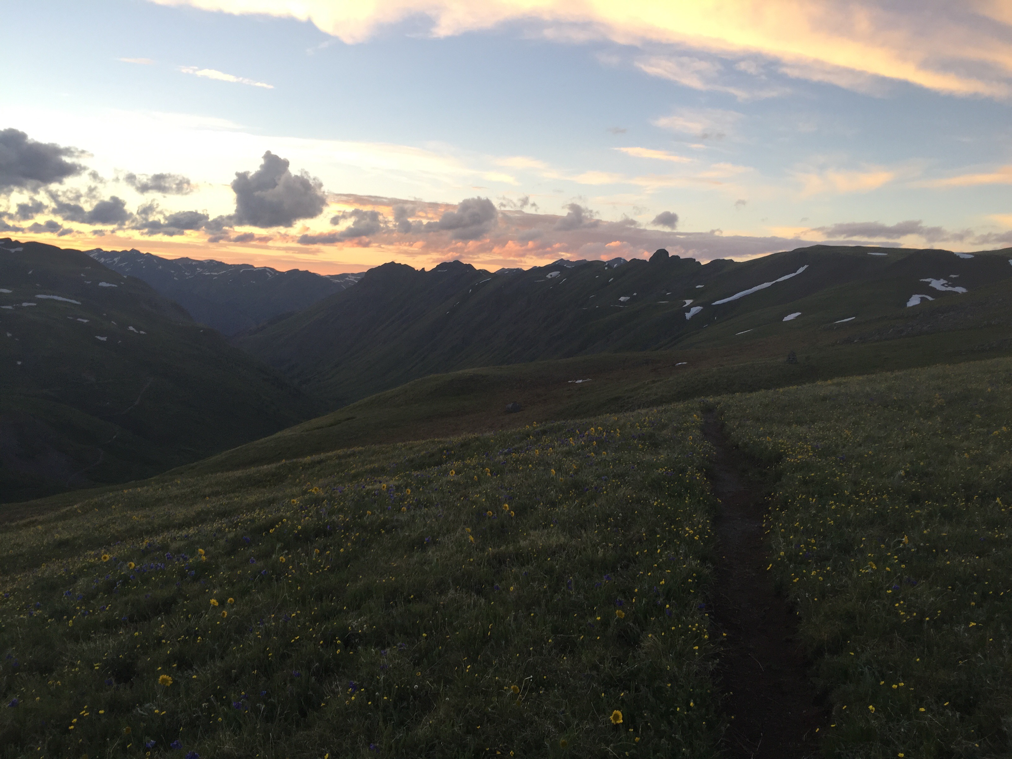 The morning miles were easy and luckily dry again. The San Juans are unbelievable between the wildlife, wildflowers, and the high mountains I couldn’t ask for more. The trail is slow going, snow passes still await us, and the sky always is threatening, but we continue only . There was a steep climb up to a pass then down to a tiny parking lot and road. We crossed a road hearing dirt bikes and ATVs zipping around. Paperweight shouted for me to look down the road where a huge moose was running away. All I saw was its behind and I’ll agree that it was a moose. Still hoping to see one closer up. We continued on passing a stream and then climbing upward. We passed an old building off the trail that can be used in case of a storm. One snowy traverse and we met the sign for the Colorado Trail. The next few miles sure did impress being above tree line with epic views. Many sections of the trail is a stream or muddy due to all the rain and snow melt. So your feet are always soggy and stinky. Our snack, water break, and feet drying was cut short as dark clouds came. We were able to cover another hour of great walking. It was windy, but snow covered some of the lakes and the hiking part was easy. Still walking on snow many times and I am getting more comfortable with it. The sky was threatening and hail fell as we quickly put on rain gear. Chipmunk was waiting for us as she showed us a route to bail down to tree line as small bits of thunder boomed. It looked like a small storm and I really didn’t want to bail, but they both were scared. The CDT would stay above tree line for another 8 or so miles. We began bailing on a steep downhill as the storm passed over. We were over a mile down as the sky was bright blue and sun shone. I knew this was a mistake. It was later in the day and neither of them will ever camp above tree line. We found a campsite in trees and debated what to do. If we stopped for the day then we would certainly be above tree line tomorrow afternoon. We all ate then planned to do quite a few more miles. I was annoyed! I wished we would of just waited ten minutes for the storm to pass. This is the problem that comes with hiking with people and sharing a tent. You have to compromise. I would of kept going if I was alone… I began the stupid steep climb back up to the trail swearing to myself. We joined the CDT again and the sun was shining bright. It was tough hiking with beautiful views. I was exhausted. We joined a one lane dirt road being careful not to get hit by a few trucks on it. There top speed was 5 mph since it was such a bad road. We had more climbing and I was crawling. We were close to 25 miles already on the day. I stayed behind as they busted it up the hills and onto the divide. I stopped for a water break and snack alone knowing I could tent safely in the meadow. I took my time and headed up the pass alone as the sun began to set. From 7-8:39 is the best time of the day to hike. The animals are about and the sky explodes with beautiful colors. Actually hiking the divide is stunning! I met up with the two of them waiting at a junction for me where we would drop down from the divide and trail to a campsite in the trees. Again, I would of camped in the open. We hiked for almost another hour having to put on our headlamps and find a spot in the trees. The sky was clear and the stars were shining. No time to cook again just snacking since it was so cold I quickly climbed into the tent. I wished to be sleeping on the divide under the stars, but I compromised. It was a clear night with no rain or thunderstorms. I was exhausted and slept well.