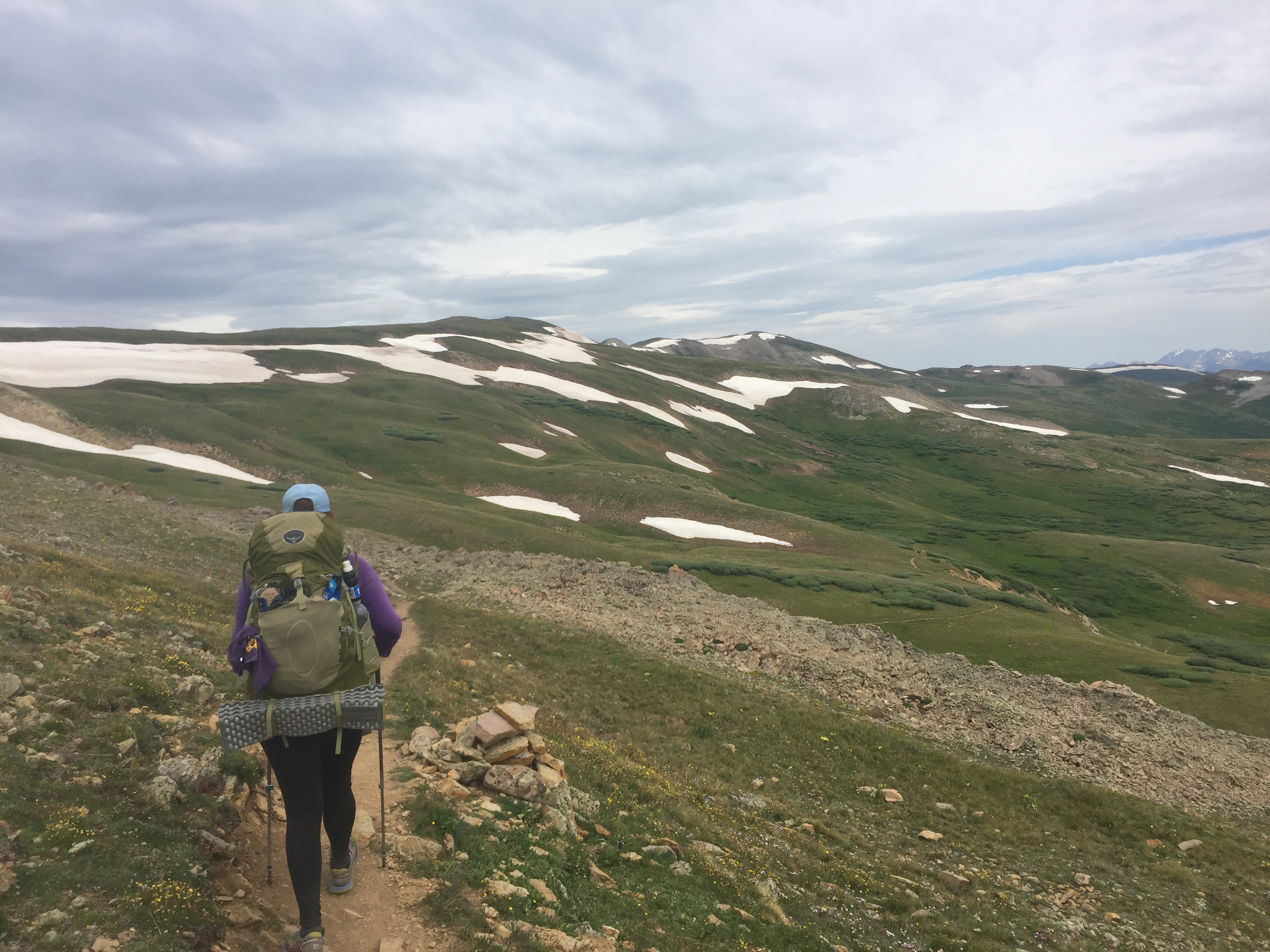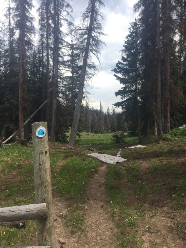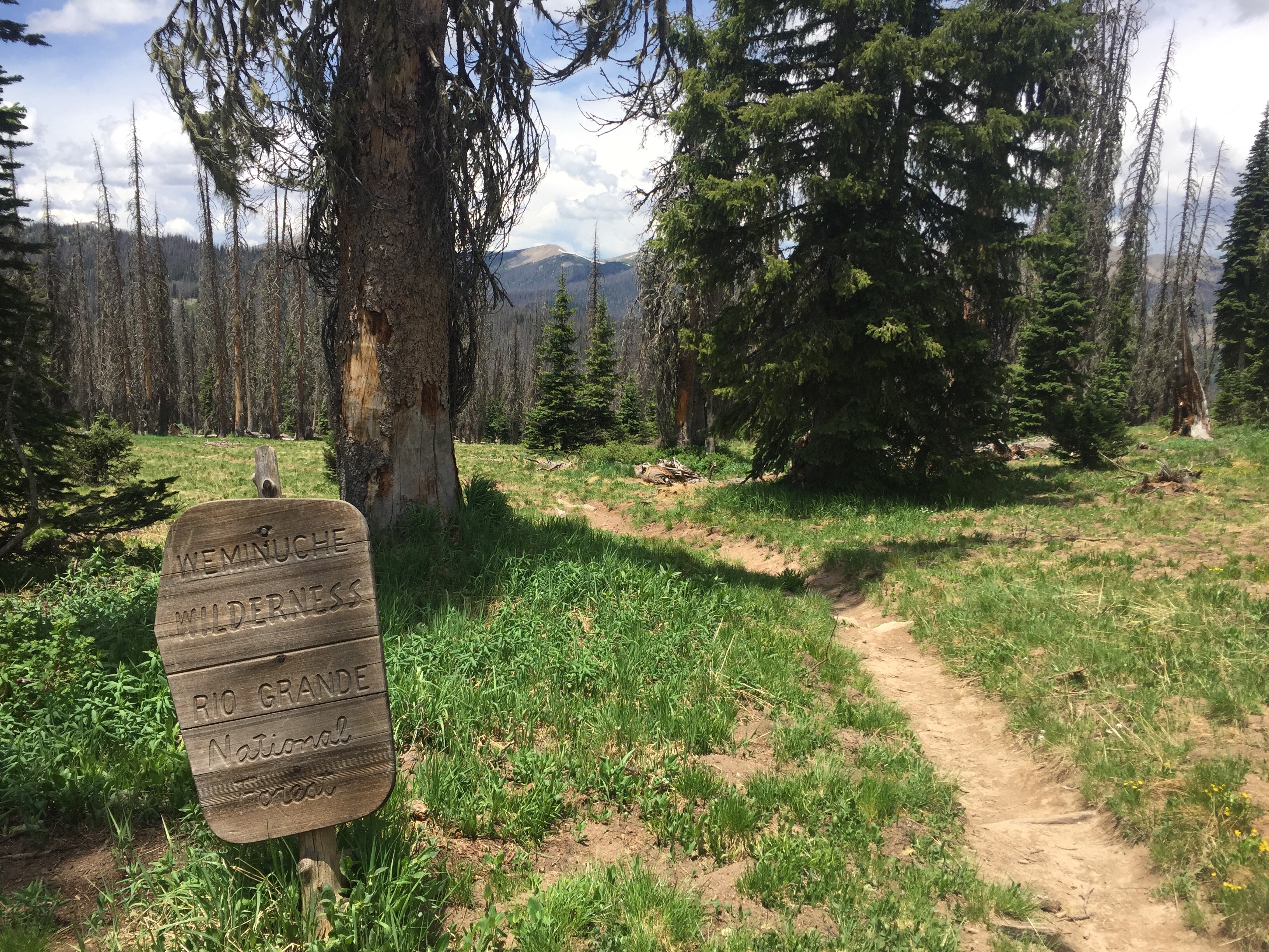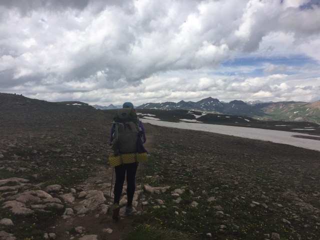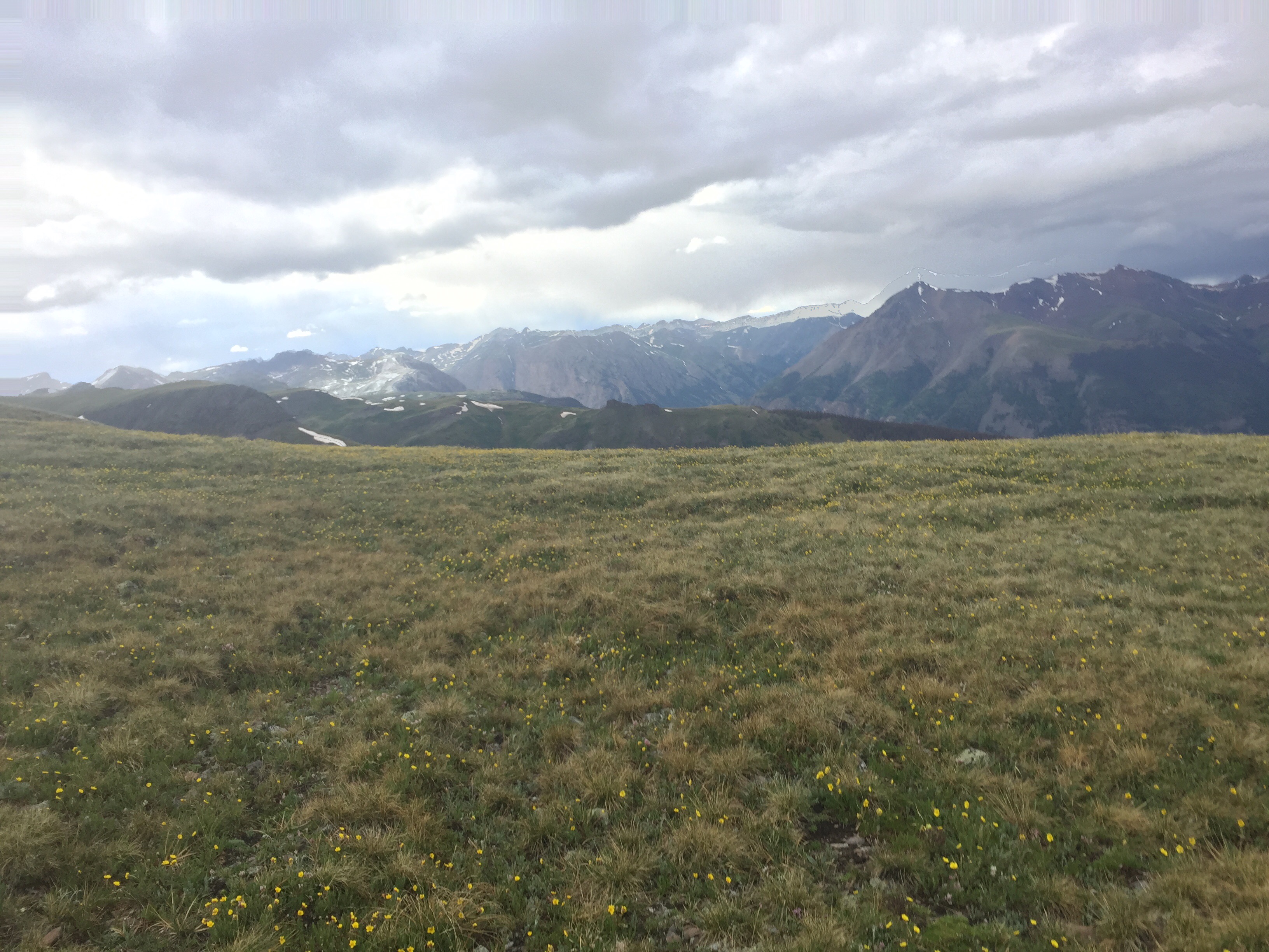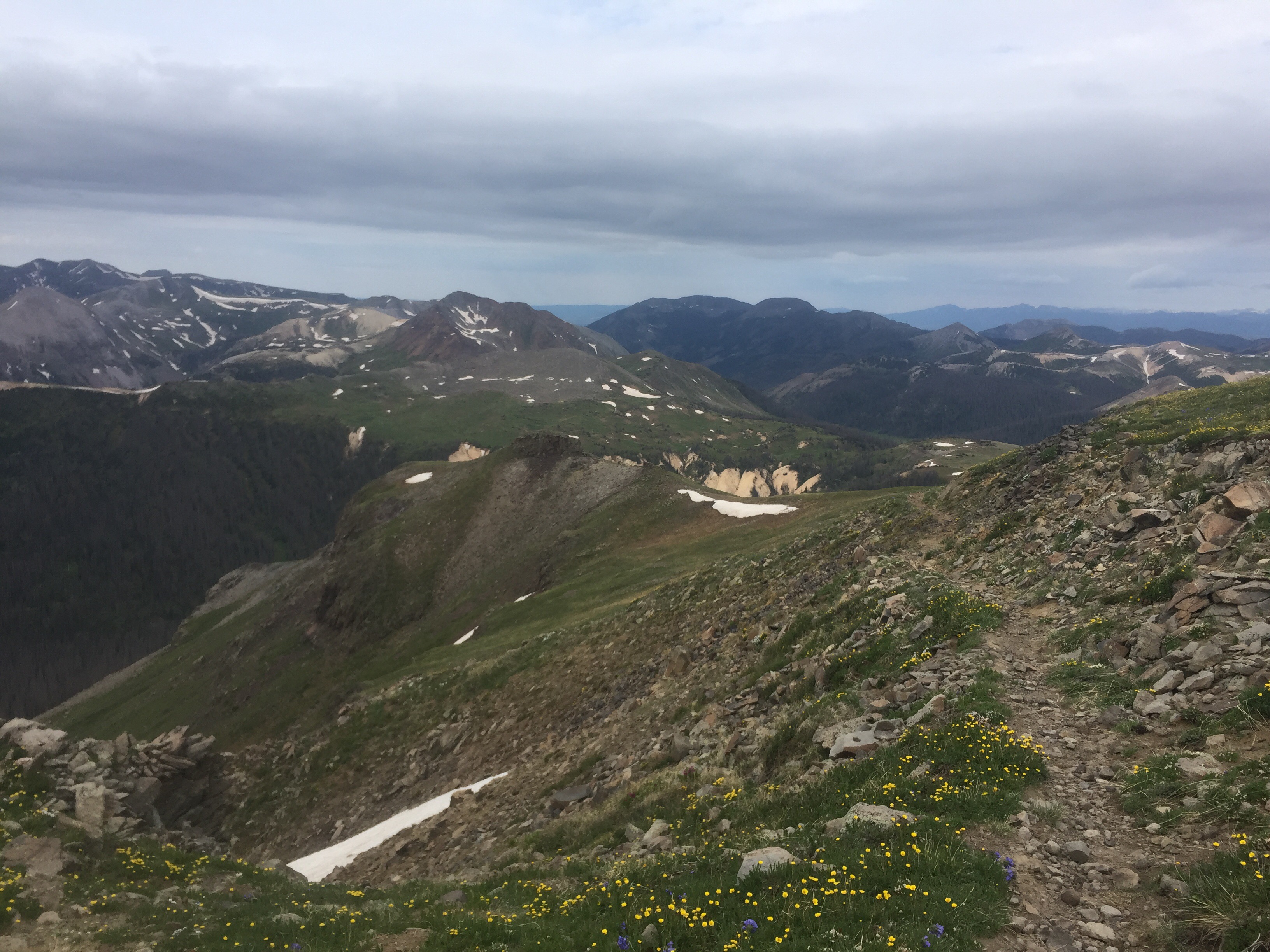 We all slept in until 8am in the most comfortable bed so far on trail. We borrowed the bikes and did a run to the post office then a food truck nearby. I had a delicious meal to give me strength for the hike out of town. Around 11, the three of us were hitching and within ten minutes we were riding back to Wolf Creek Pass. Lots of tourists taking photos at the sign so we took a few too then crossed the busy road avoiding the semis and huge RVs. I have 7 days of food in my pack along with an ice axe and microspikes. It takes some effort to throw it on my back. We began the first uphill climb into the San Juans. Epic views and wildflowers galore. We entered the Weminuche Wilderness which I’m told is one of the most beautiful places in the country. The first day sure did impress me! The trail was nicely maintained heading up and down various mountains onward to the next one in sight. Small ponds and lakes surrounded by rock boulders of varying size. At the higher elevations, marmots ran gracefully on the rocks as the pika squeak on top of rocks. Dark clouds loomed most of the afternoon. As we began the last big climb of the day, the thunder was booming so CC, PW, and I hid under some pine trees. They both cooked dinner as we stayed dry waiting out the storm. I left first continuing uphill and out of the trees to the beautiful views above tree line where I could see the trail for miles. As j reached the top and began descending the sun shone through the clouds giving me a special moment that took my breath away. I cruised along talking to the marmots and pikas with a huge smile and a full heart. These are the days I love. Little snow on the trail and cruising above tree line. I headed down where I found a campsite somewhat sheltered in the trees and began to cook dinner. They showed up a little later as we all set up camp. What a great day and we had hiked 15.2 miles out of town. I fell asleep warm next to Paperweight as we were both eager to see what tomorrow would bring.