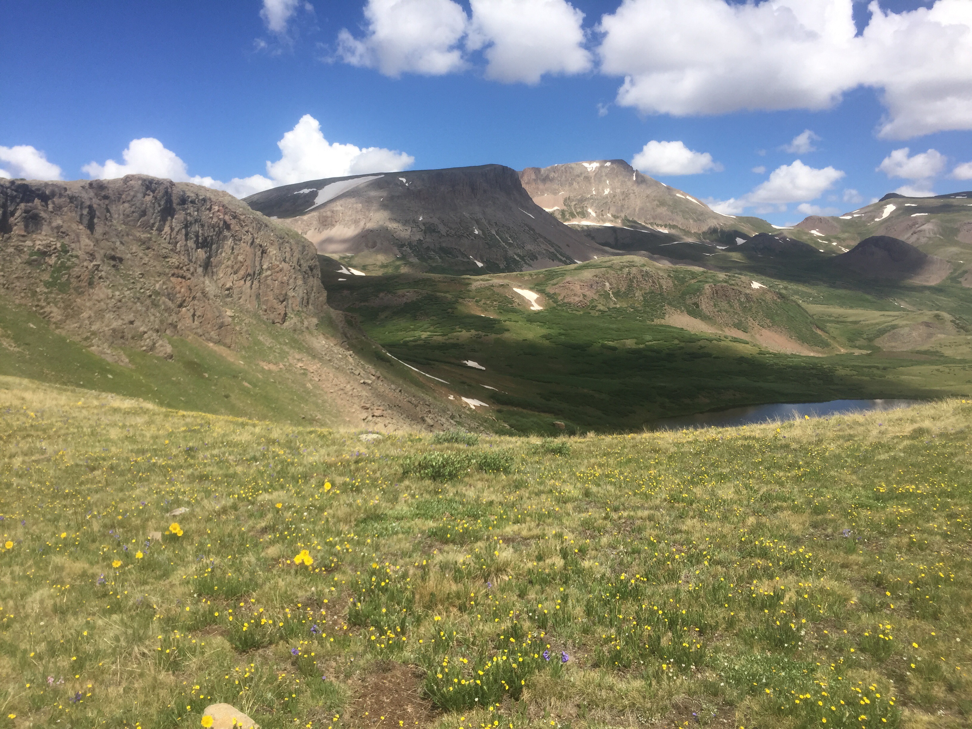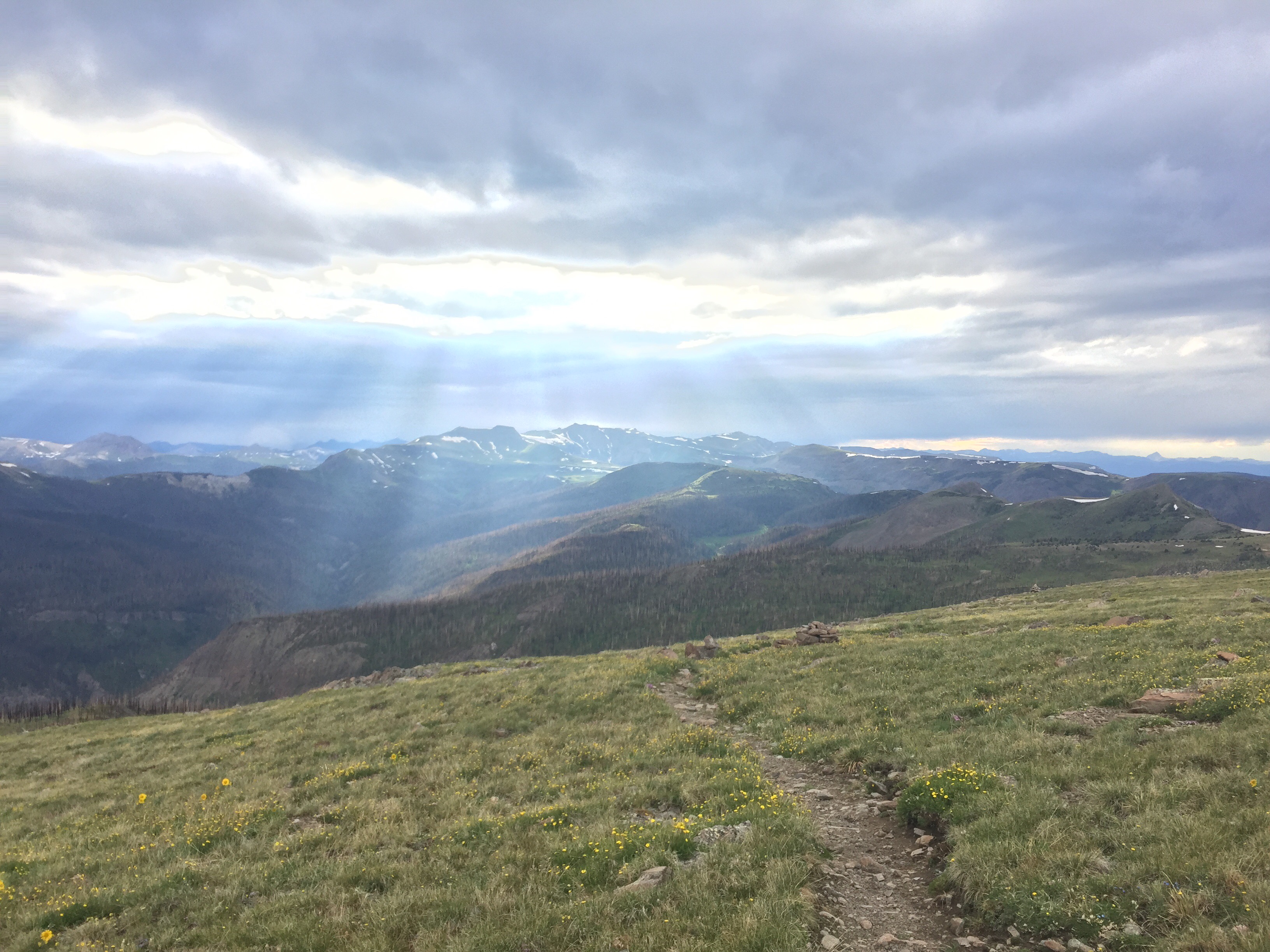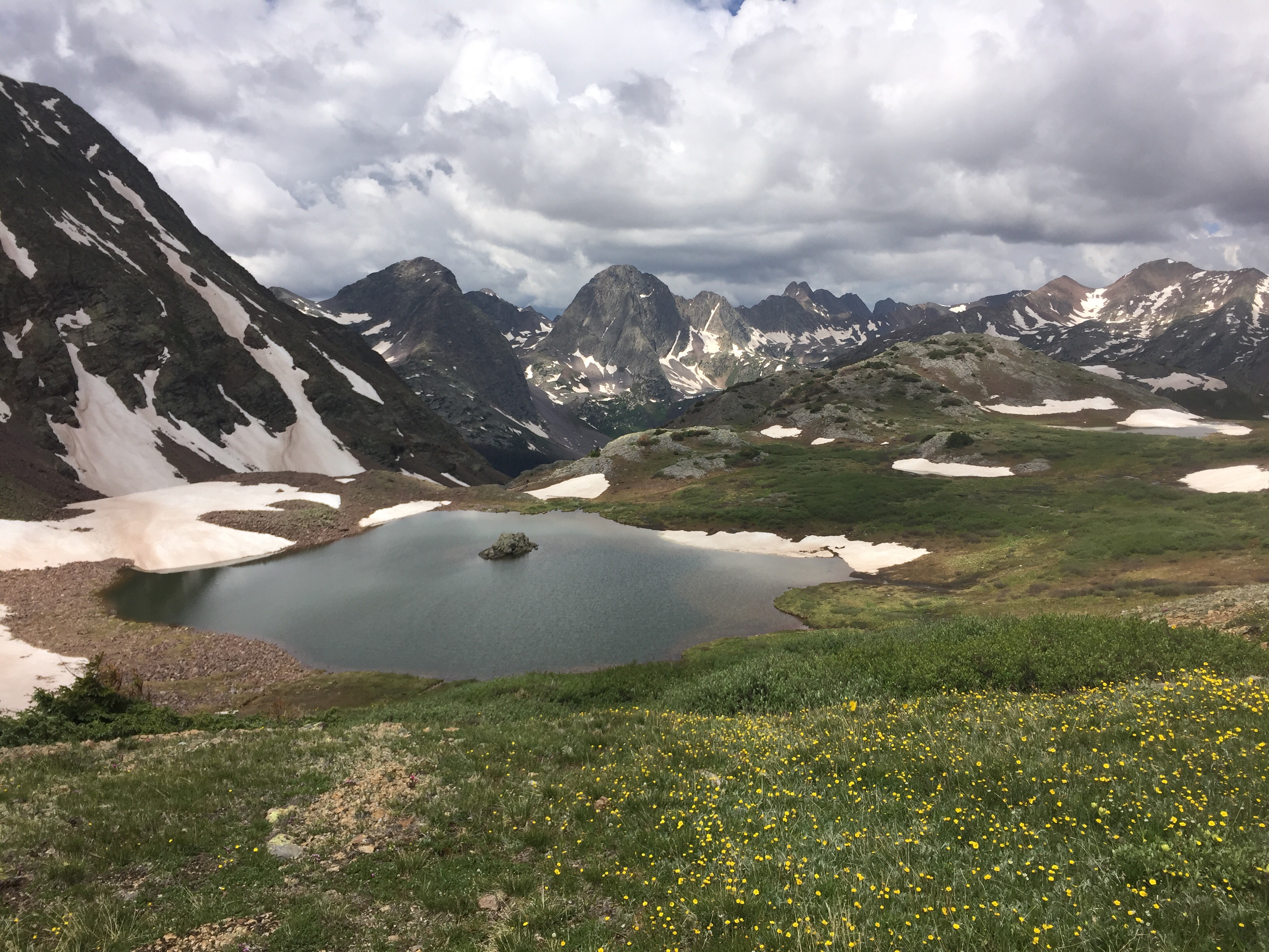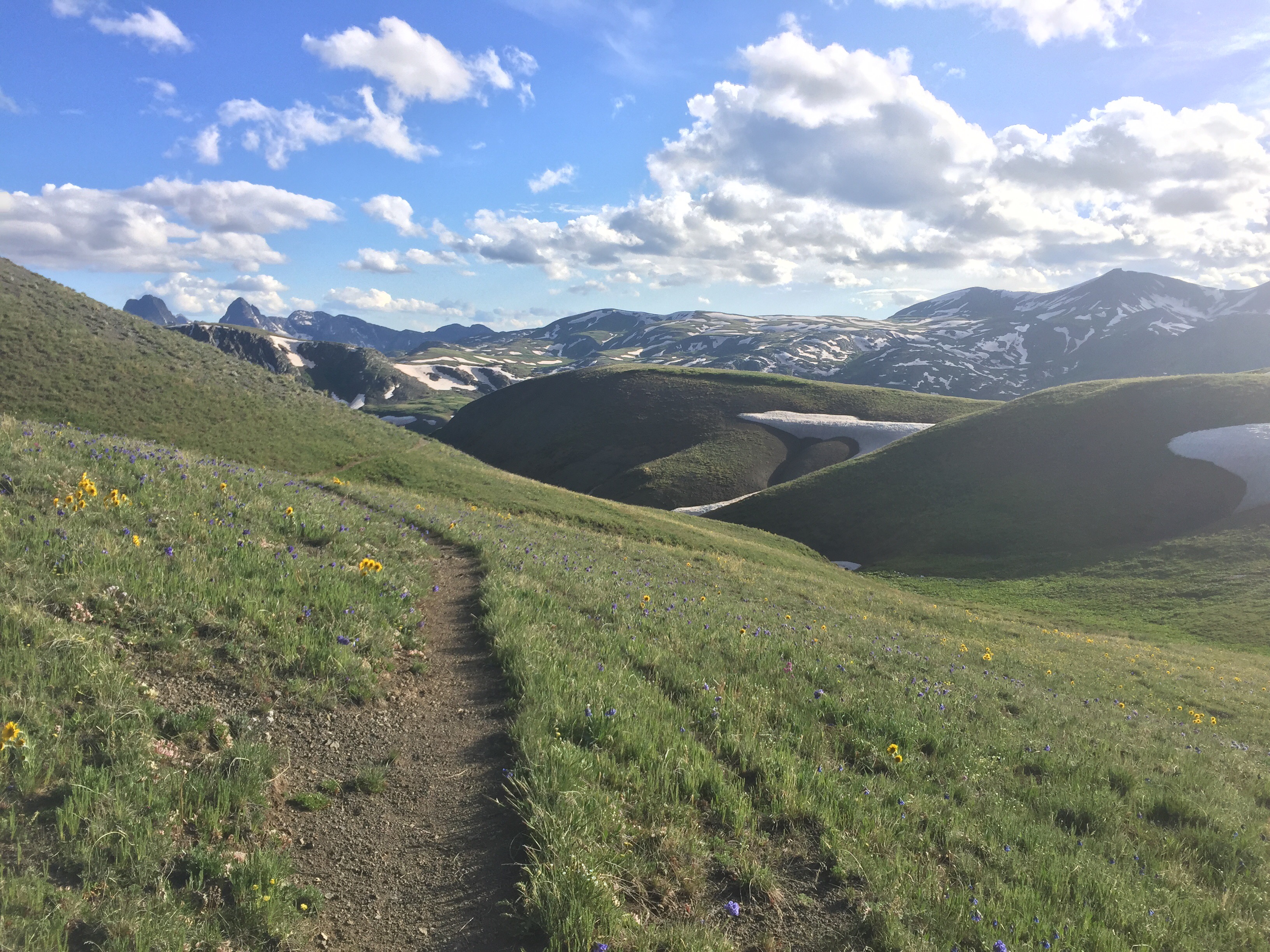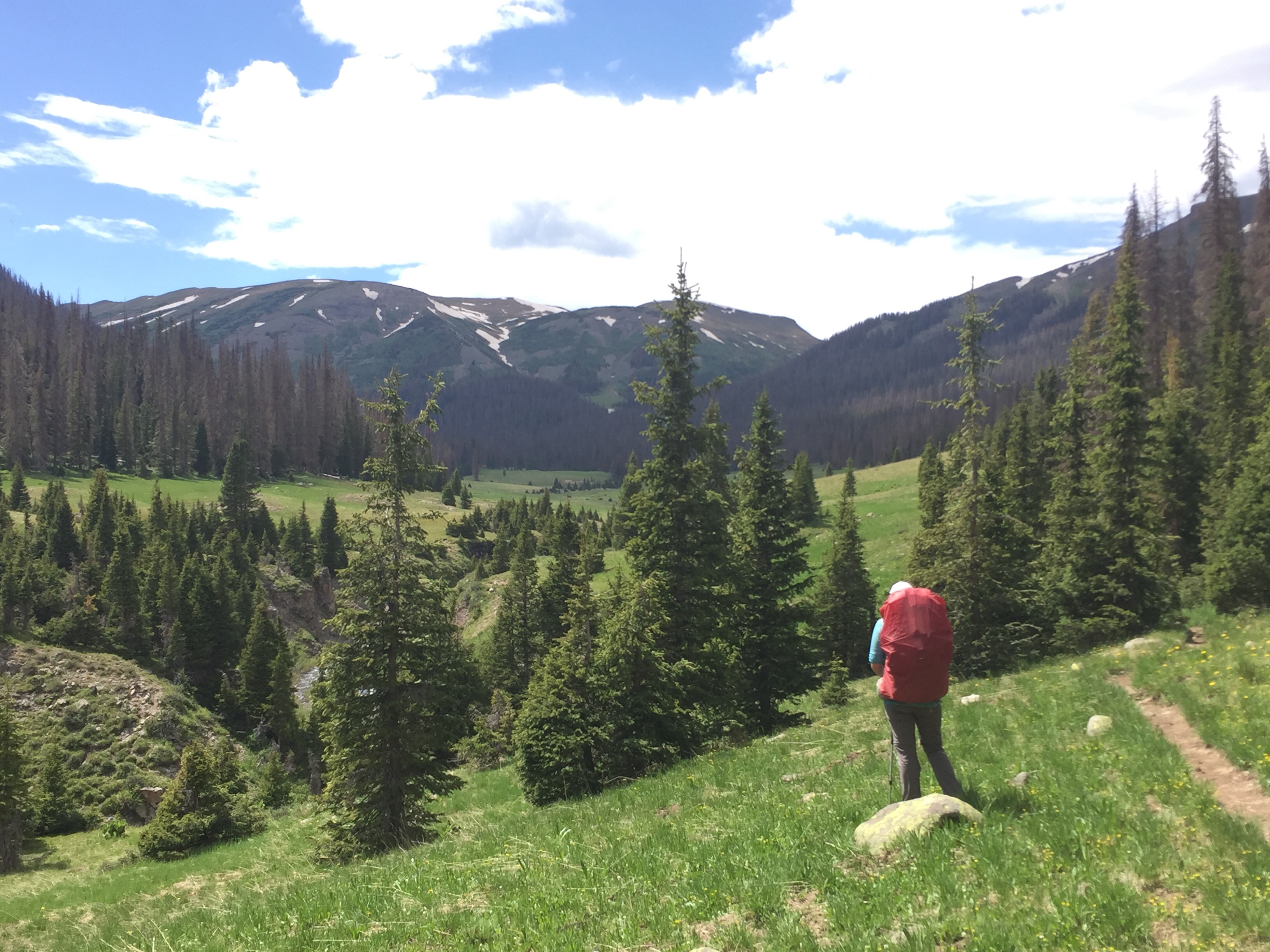 We all slept in until 8am in the most comfortable bed so far on trail. We borrowed the bikes and did a run to the post office then a food truck nearby. I had a delicious meal to give me strength for the hike out of town. Around 11, the three of us were hitching and within ten minutes we were riding back to Wolf Creek Pass. Lots of tourists taking photos at the sign so we took a few too then crossed the busy road avoiding the semis and huge RVs. I have 7 days of food in my pack along with an ice axe and microspikes. It takes some effort to throw it on my back. We began the first uphill climb into the San Juans. Epic views and wildflowers galore. We entered the Weminuche Wilderness which I’m told is one of the most beautiful places in the country. The first day sure did impress me! The trail was nicely maintained heading up and down various mountains onward to the next one in sight. Small ponds and lakes surrounded by rock boulders of varying size. At the higher elevations, marmots ran gracefully on the rocks as the pika squeak on top of rocks. Dark clouds loomed most of the afternoon. As we began the last big climb of the day, the thunder was booming so CC, PW, and I hid under some pine trees. They both cooked dinner as we stayed dry waiting out the storm. I left first continuing uphill and out of the trees to the beautiful views above tree line where I could see the trail for miles. As j reached the top and began descending the sun shone through the clouds giving me a special moment that took my breath away. I cruised along talking to the marmots and pikas with a huge smile and a full heart. These are the days I love. Little snow on the trail and cruising above tree line. I headed down where I found a campsite somewhat sheltered in the trees and began to cook dinner. They showed up a little later as we all set up camp. What a great day and we had hiked 15.2 miles out of town. I fell asleep warm next to Paperweight as we were both eager to see what tomorrow would bring.