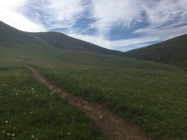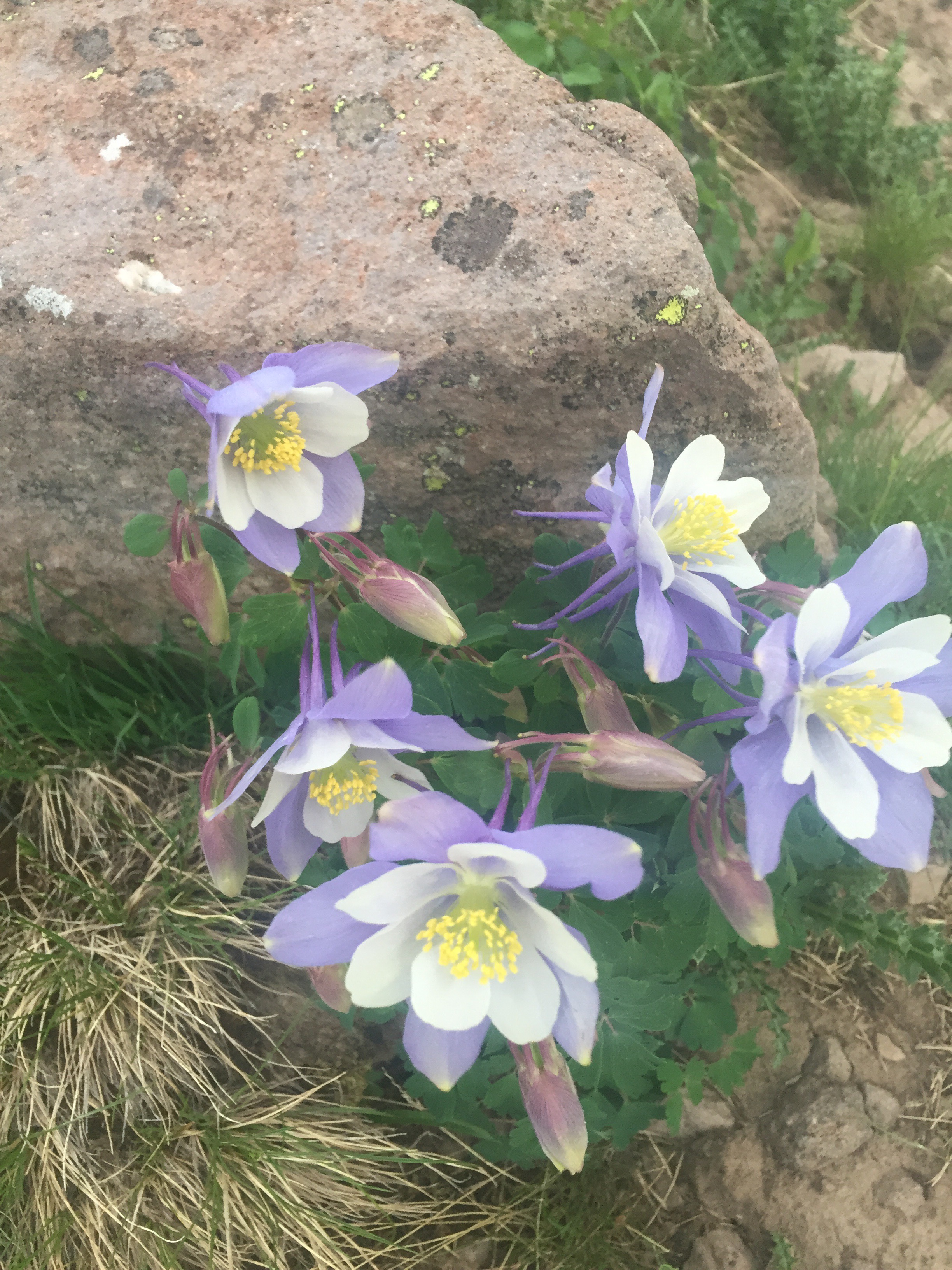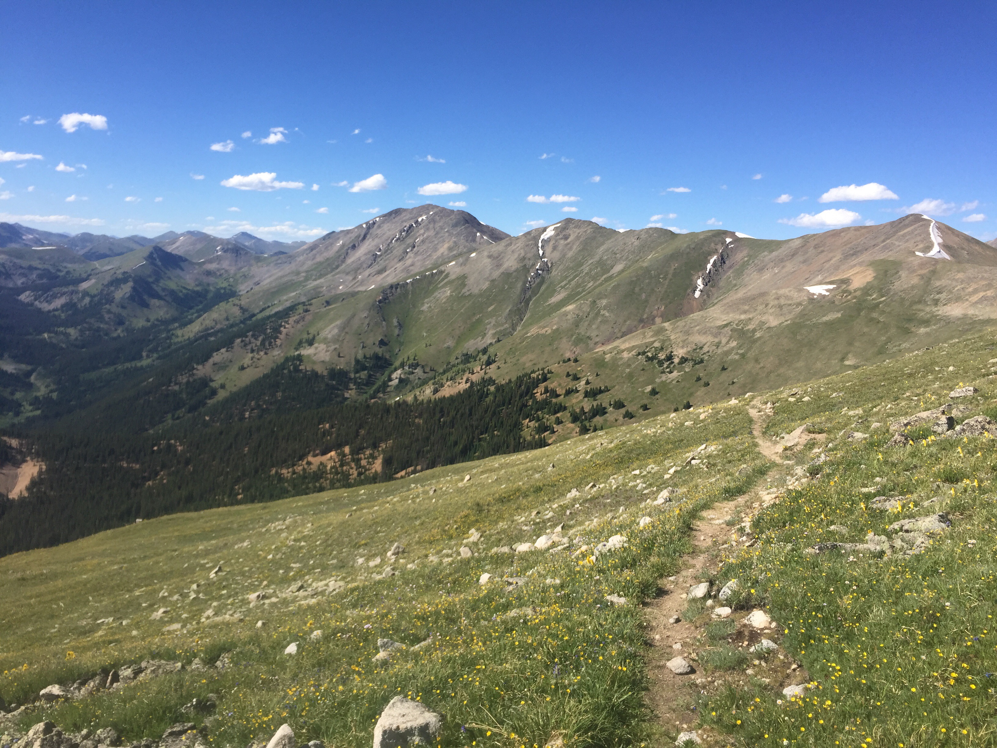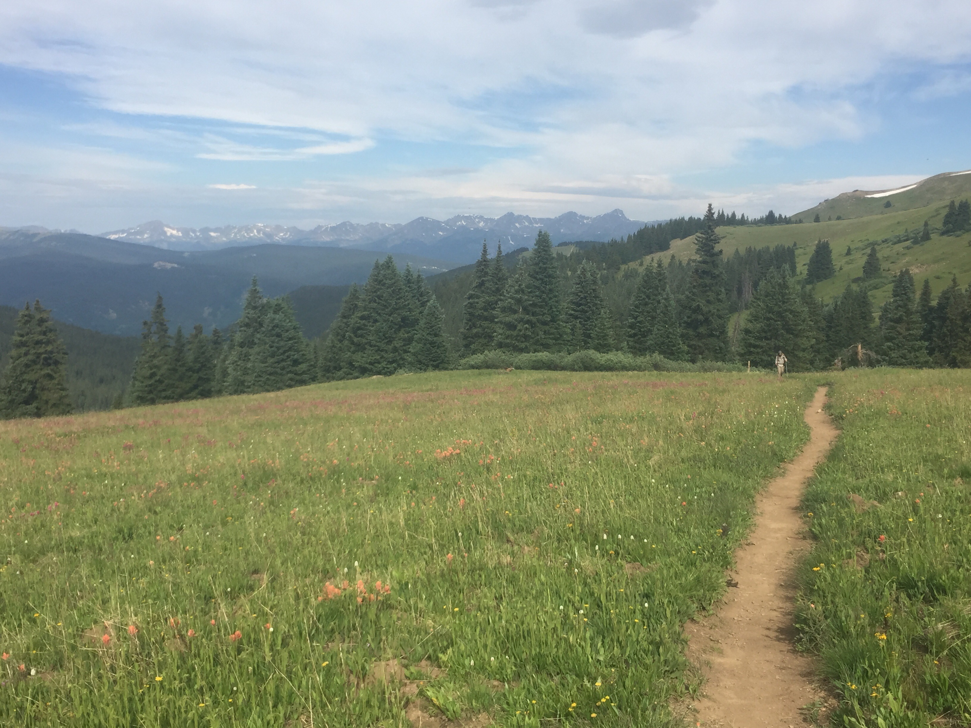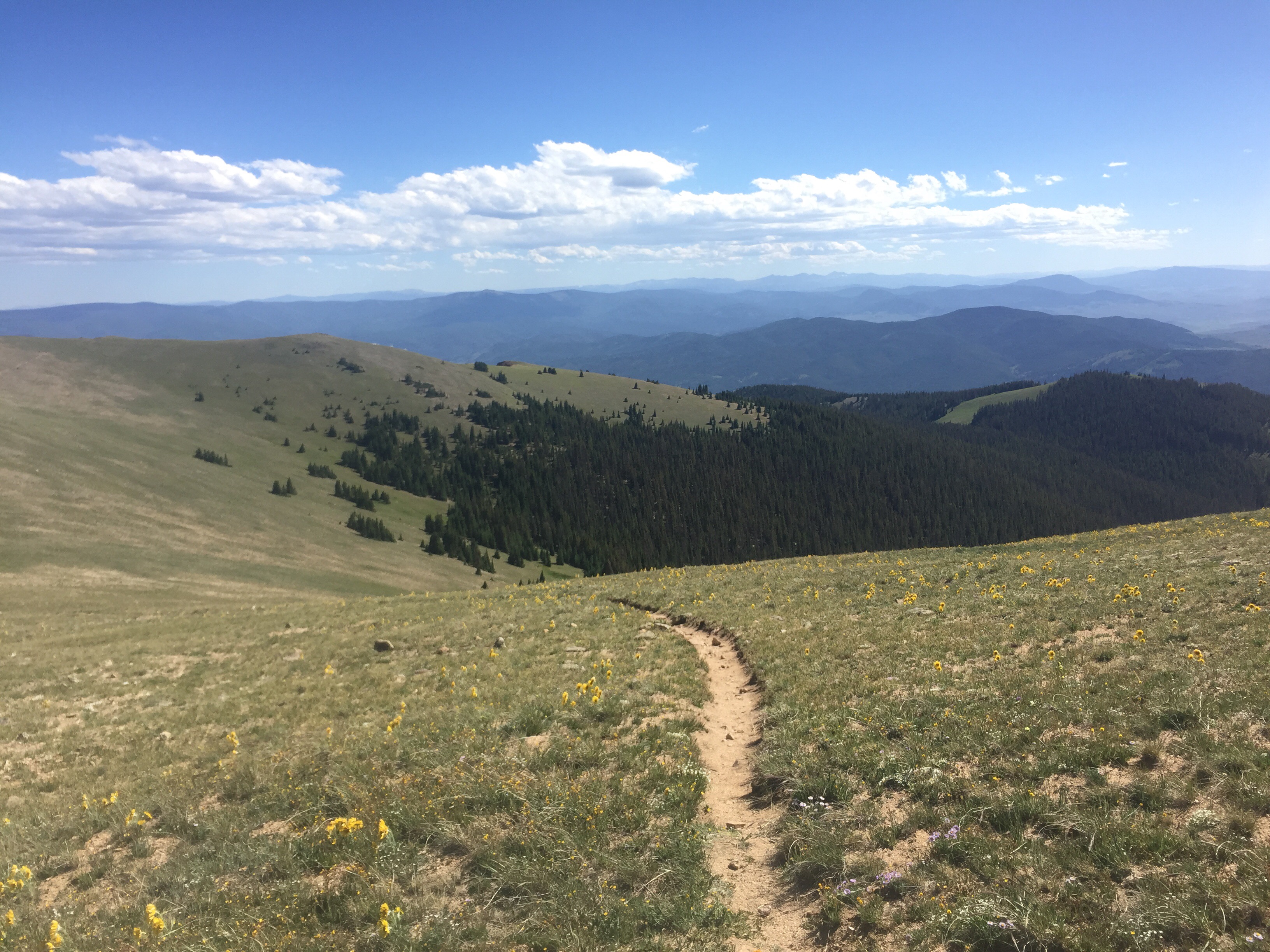 We all slept in until 8am in the most comfortable bed so far on trail. We borrowed the bikes and did a run to the post office then a food truck nearby. I had a delicious meal to give me strength for the hike out of town. Around 11, the three of us were hitching and within ten minutes we were riding back to Wolf Creek Pass. Lots of tourists taking photos at the sign so we took a few too then crossed the busy road avoiding the semis and huge RVs. I have 7 days of food in my pack along with an ice axe and microspikes. It takes some effort to throw it on my back. We began the first uphill climb into the San Juans. Epic views and wildflowers galore. We entered the Weminuche Wilderness which I’m told is one of the most beautiful places in the country. The first day sure did impress me! The trail was nicely maintained heading up and down various mountains onward to the next one in sight. Small ponds and lakes surrounded by rock boulders of varying size. At the higher elevations, marmots ran gracefully on the rocks as the pika squeak on top of rocks. Dark clouds loomed most of the afternoon. As we began the last big climb of the day, the thunder was booming so CC, PW, and I hid under some pine trees. They both cooked dinner as we stayed dry waiting out the storm. I left first continuing uphill and out of the trees to the beautiful views above tree line where I could see the trail for miles. As j reached the top and began descending the sun shone through the clouds giving me a special moment that took my breath away. I cruised along talking to the marmots and pikas with a huge smile and a full heart. These are the days I love. Little snow on the trail and cruising above tree line. I headed down where I found a campsite somewhat sheltered in the trees and began to cook dinner. They showed up a little later as we all set up camp. What a great day and we had hiked 15.2 miles out of town. I fell asleep warm next to Paperweight as we were both eager to see what tomorrow would bring.