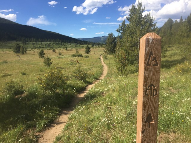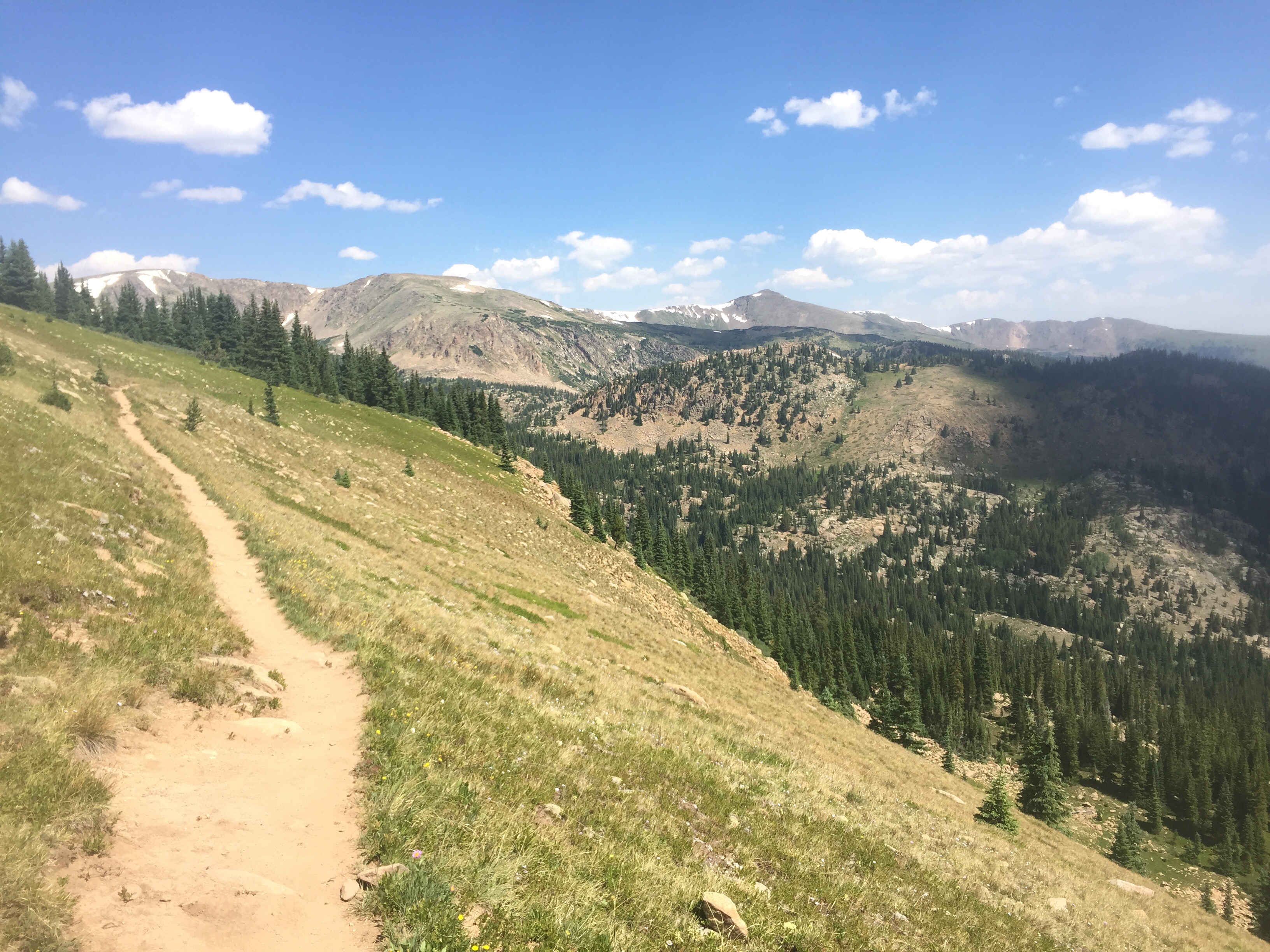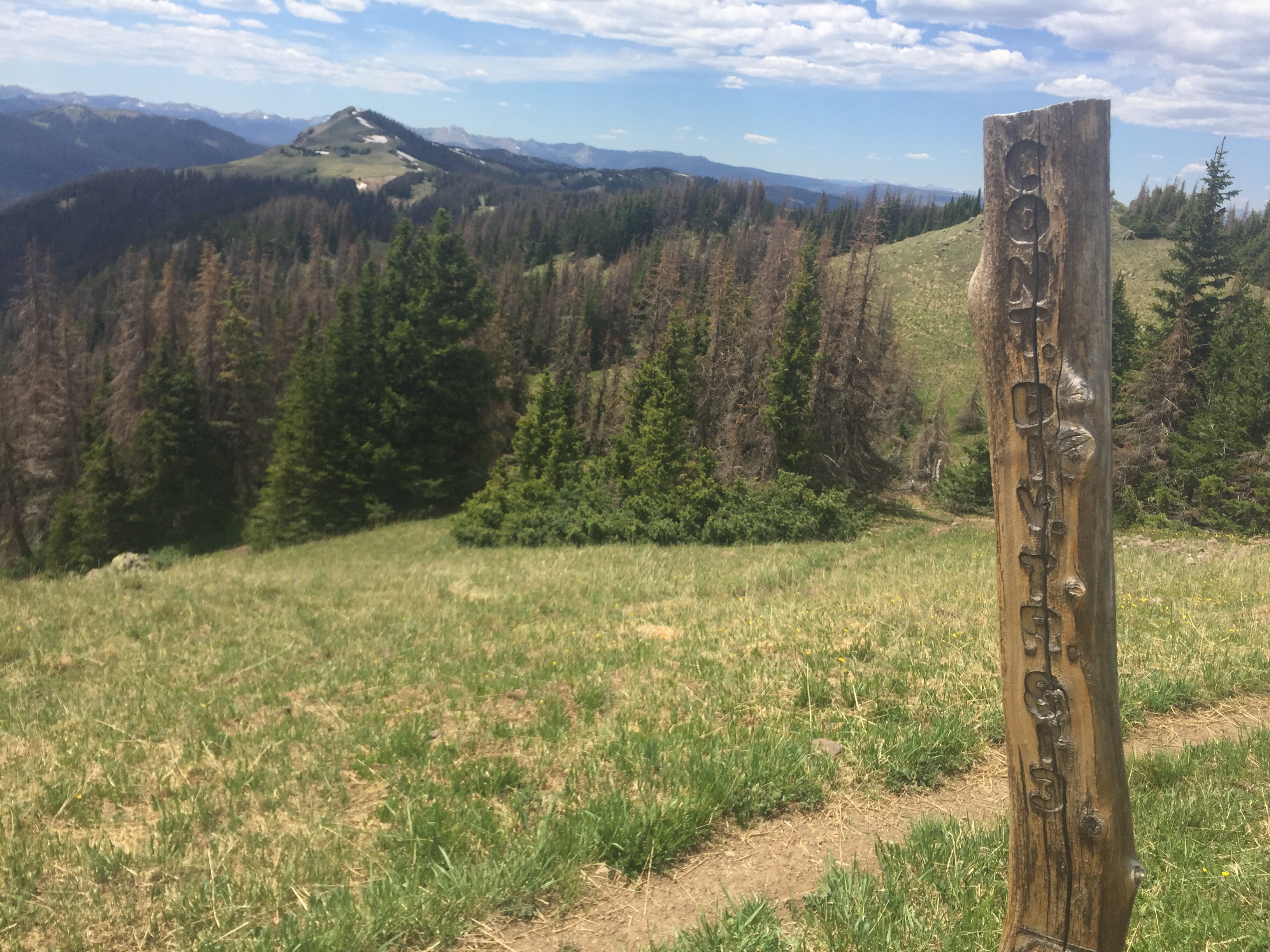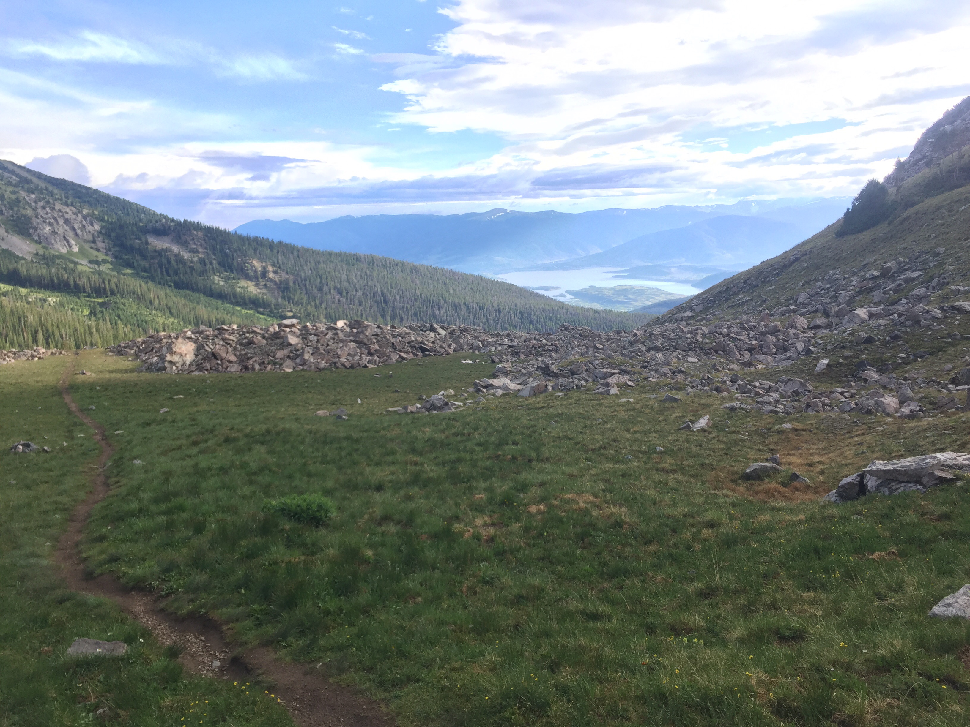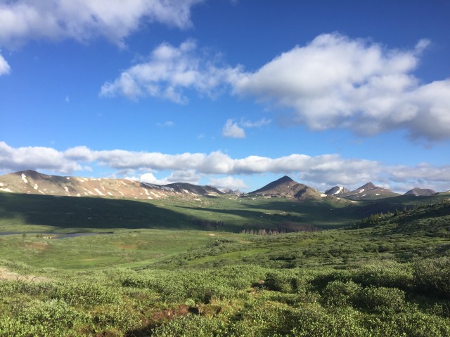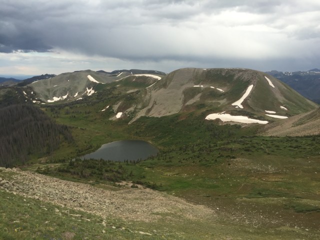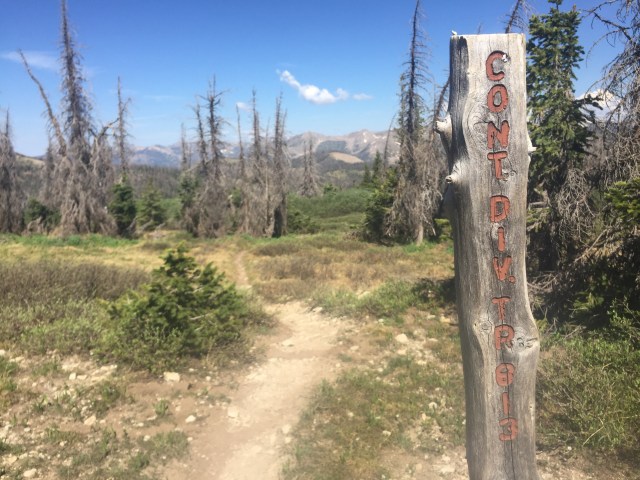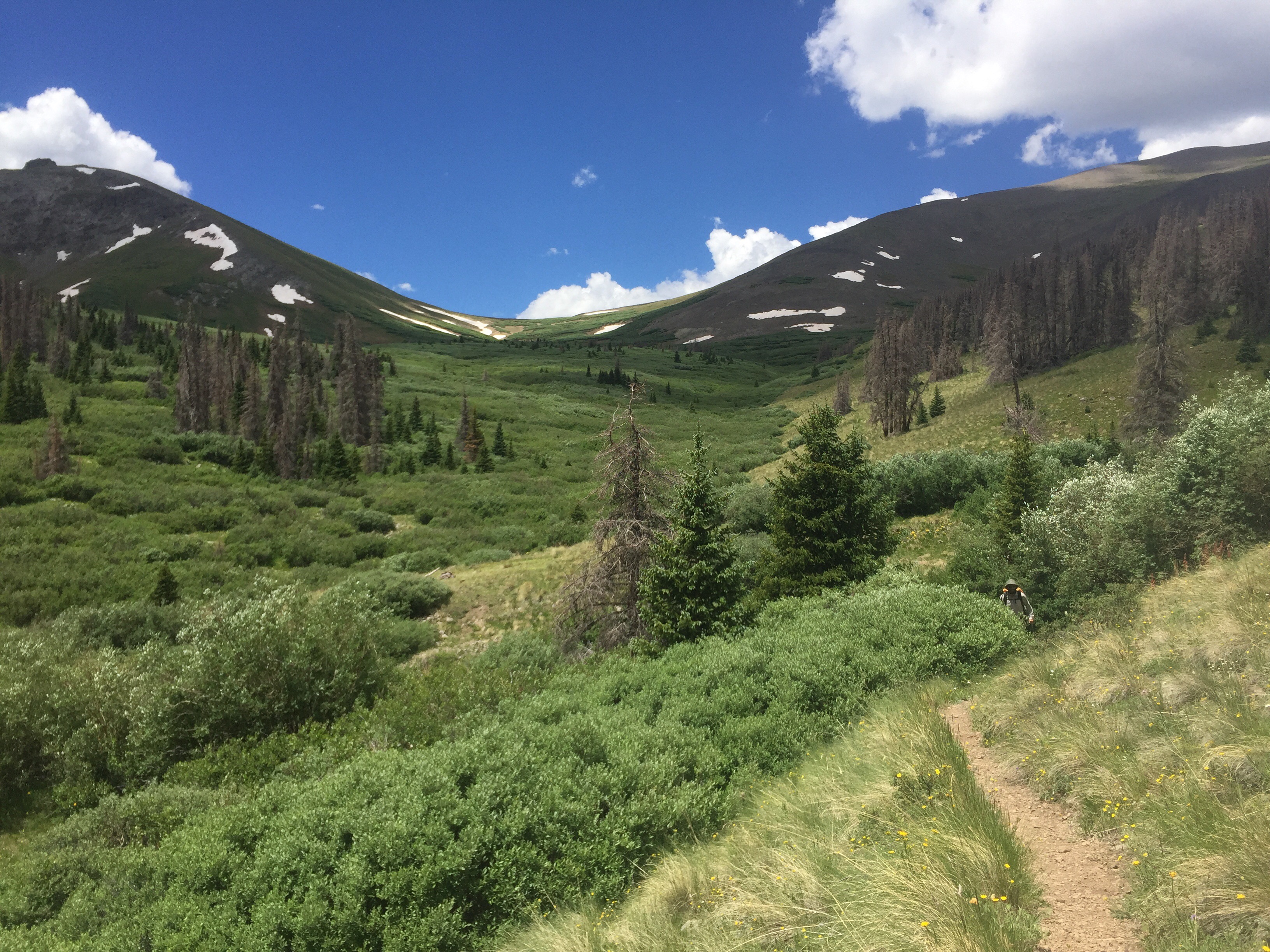 We all slept in until 8am in the most comfortable bed so far on trail. We borrowed the bikes and did a run to the post office then a food truck nearby. I had a delicious meal to give me strength for the hike out of town. Around 11, the three of us were hitching and within ten minutes we were riding back to Wolf Creek Pass. Lots of tourists taking photos at the sign so we took a few too then crossed the busy road avoiding the semis and huge RVs. I have 7 days of food in my pack along with an ice axe and microspikes. It takes some effort to throw it on my back. We began the first uphill climb into the San Juans. Epic views and wildflowers galore. We entered the Weminuche Wilderness which I’m told is one of the most beautiful places in the country. The first day sure did impress me! The trail was nicely maintained heading up and down various mountains onward to the next one in sight. Small ponds and lakes surrounded by rock boulders of varying size. At the higher elevations, marmots ran gracefully on the rocks as the pika squeak on top of rocks. Dark clouds loomed most of the afternoon. As we began the last big climb of the day, the thunder was booming so CC, PW, and I hid under some pine trees. They both cooked dinner as we stayed dry waiting out the storm. I left first continuing uphill and out of the trees to the beautiful views above tree line where I could see the trail for miles. As j reached the top and began descending the sun shone through the clouds giving me a special moment that took my breath away. I cruised along talking to the marmots and pikas with a huge smile and a full heart. These are the days I love. Little snow on the trail and cruising above tree line. I headed down where I found a campsite somewhat sheltered in the trees and began to cook dinner. They showed up a little later as we all set up camp. What a great day and we had hiked 15.2 miles out of town. I fell asleep warm next to Paperweight as we were both eager to see what tomorrow would bring.