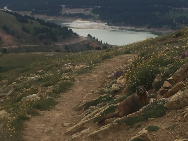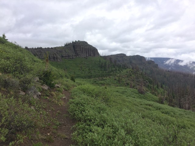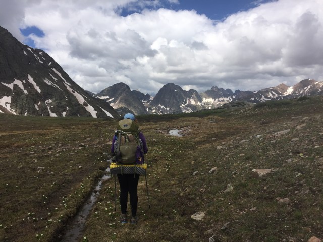 Today we were able to put in the miles. It was not raining when we started, but I was chilly. After a bit of the uphill I took off a layer. We had a short break in the sun before the clouds passed over and we hurried on. Water is flowing meaning waterfalls cascading down form the rocks. I could see Chipmunk over a mile ahead of me around a curve. Everything is blooming and the colors are stunning. Snow piles also dot the landscape. We took a snack break to dry out everything while we could. After our long drying break, we began to pack up as the rain cloud came overhead. So we put on all our rain gear again and headed down towards a meadow. The meadows are wet and we headed towards a raging river. By following the trail you come to water chest deep and no way to cross. We saw other footprints leading to a spot where you can jump across. I made it and quickly realized my phone was gone. I ran back finding in a few feet on the shore. I would of likely jumped in the deep water to search for it. Remember to secure your phone and waterproof cases are essential. We walked in the rain viewing elk in the distance. This was followed by an uphill where the rain eventually let up. You view a notch in the rocks called the window that we hoped the trail would climb through. It did not, but the rock formations were spectacular. We had planned to camp with Chipmunk at a lake, but we realized the trail did not go down to to it. No time for side trips. We continued uphill as I was exhausted and a few minutes later we found her in a patch of trees drying out her things. We found a spot nearby where we quickly set up our dry tent and then cooked a warm meal. It got very cold quickly as the sun was setting. At least tonight our sleeping bags and tent are dry so it was time for bed. During the night there was a lightning storm, but I slept right through it.