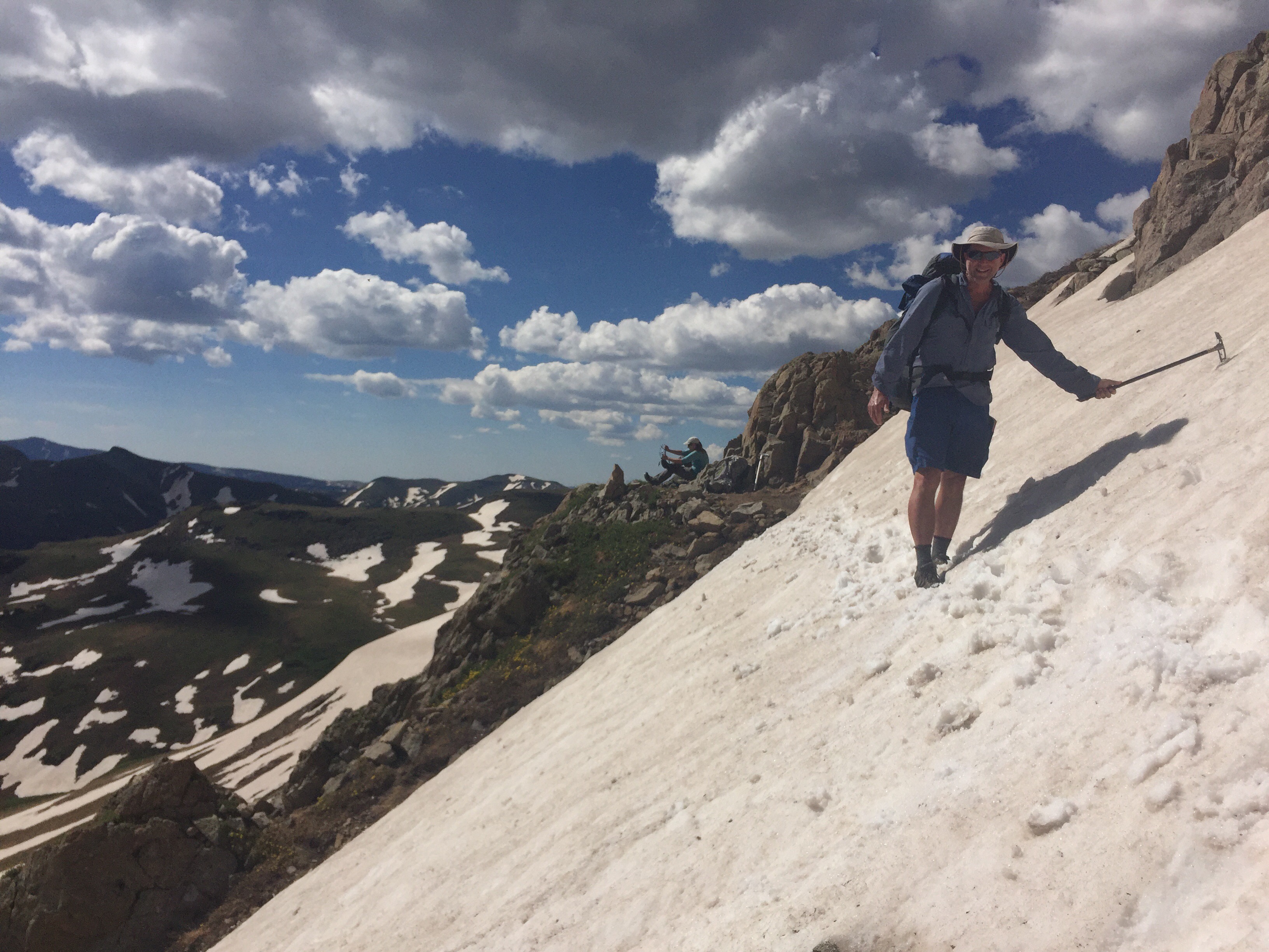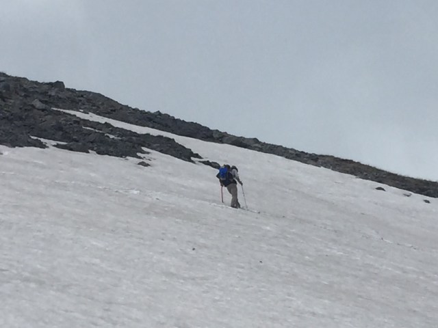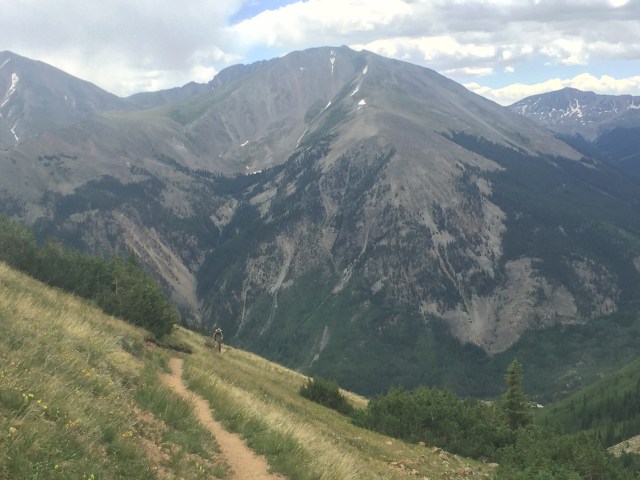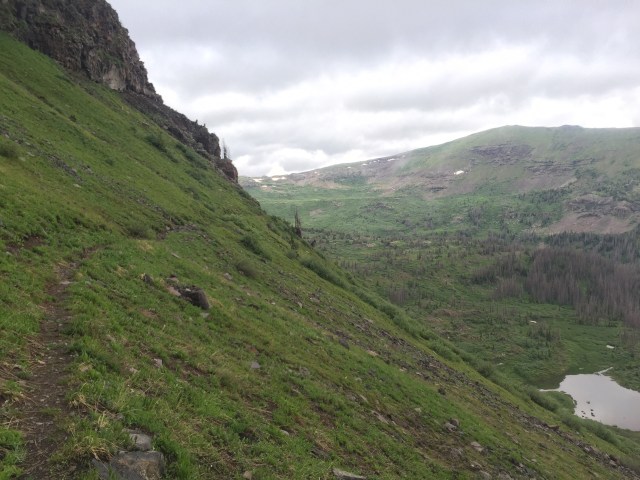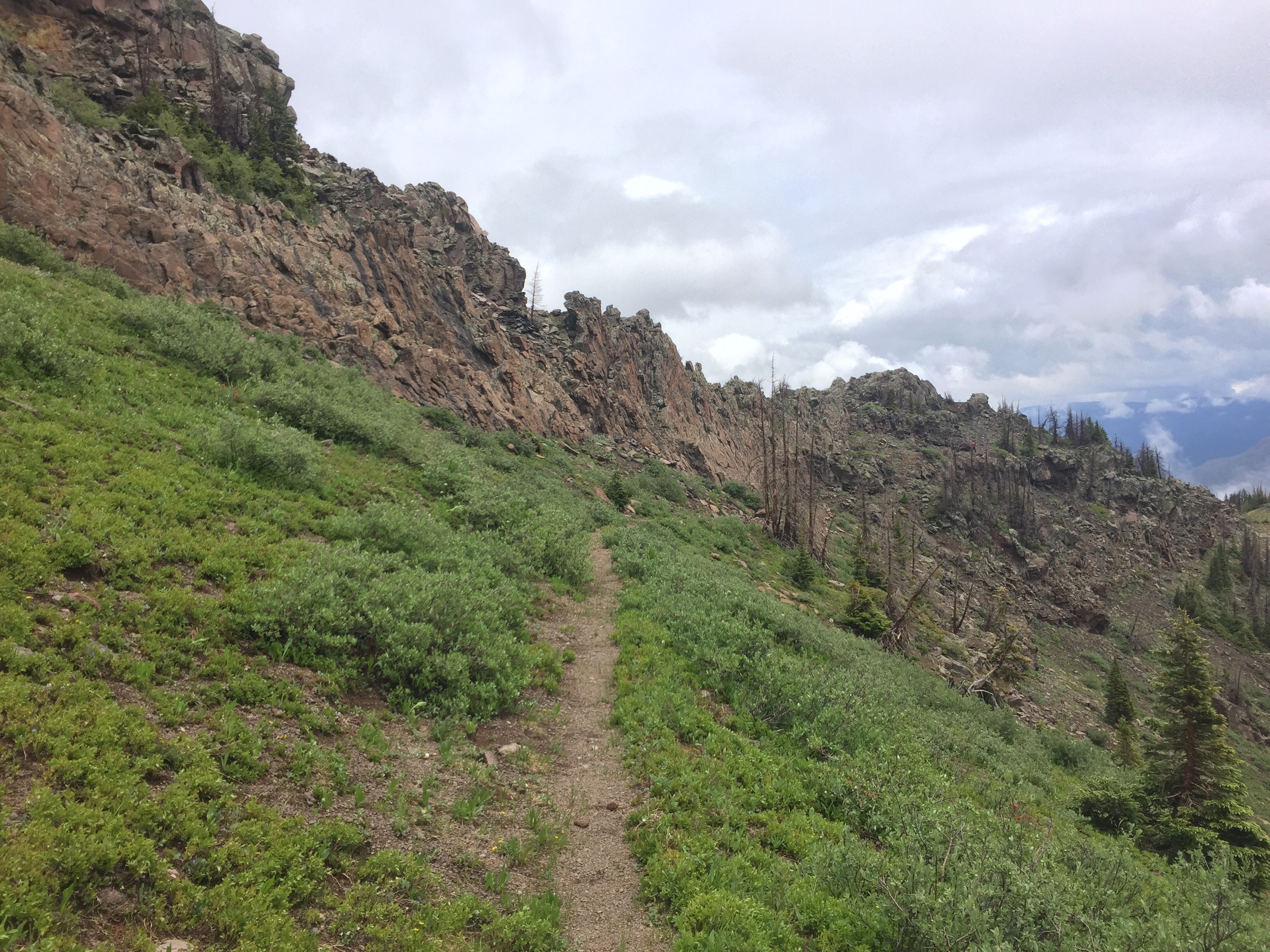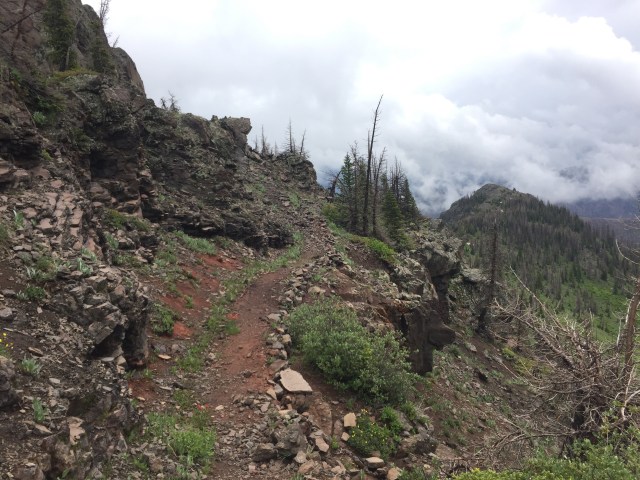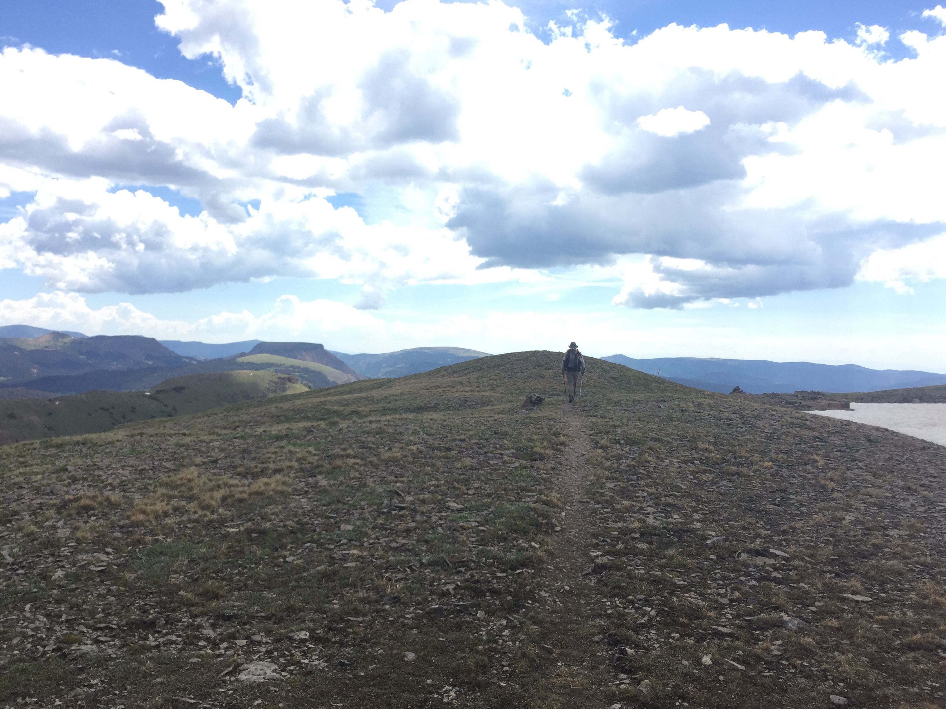 It continued to rain as we cuddled in our tight quarters in our two person tent. The sky looked horrible so we did not get out for a long time. We drifted back to sleep for a bit then snacked the morning hours away. I think it was after 10:30 when we finally emerged to sun coming out. We packed up our wet tent as the hail and snow had melted. We climbed back up to the trail rubbing against wet bushes as I tried to warm up. We were lucky as the sun graced us with her presence for even tough to do a tricky section. The views were unreal as we switchbacked up a trail that I didn’t notice was even there. We turned the corner to see the famous knifes edge staring at us with still a few snowy passes. I waited for PW to catch up as I began getting nervous. He does a wonderful job calming me down. It was careful stepping and we crossed the first two passes easily. The next one had no prints in the snow and it looked like going down off the trail onto the loose rocks would be the best bet. I made it down a little ways before a panic attack set in and I felt like I would fall down the rocks to the bottom. He took his time and slowly made it back to the trail. I tried so hard to keep going, but I was so fearful as my hiking poles slid out of my hand. I tried to calm down and he said encouraging words, but I was frozen on the rocks. He took off his pack and came back for me. He hugged me, took my pack, and slowly led me to safety. What would I do without him? Maybe I would of quit a long time ago back before we bailed to Platoro. The next few passes were easy as well as I reminded him I don’t do well on rocks. I should of just pushed through the snow. We made it safety as it began to storm again. It was a cold rain where I couldn’t get warm at all. We pushed on wanting to get back to tree line. We passed two tents in an open field, but went into the trees around 5 calling it a day after doing under 10 miles for the day. We set up in the rain and crawled in. It was wonderful to put on dry warm clothes and snack in the safety of the tent. Today was a scary and short day. I’ve only had one panic attack in my life and this was the second. I hope it won’t happen again, but I had a feeling…. We went to bed very early as the rain finally stopped for the day.