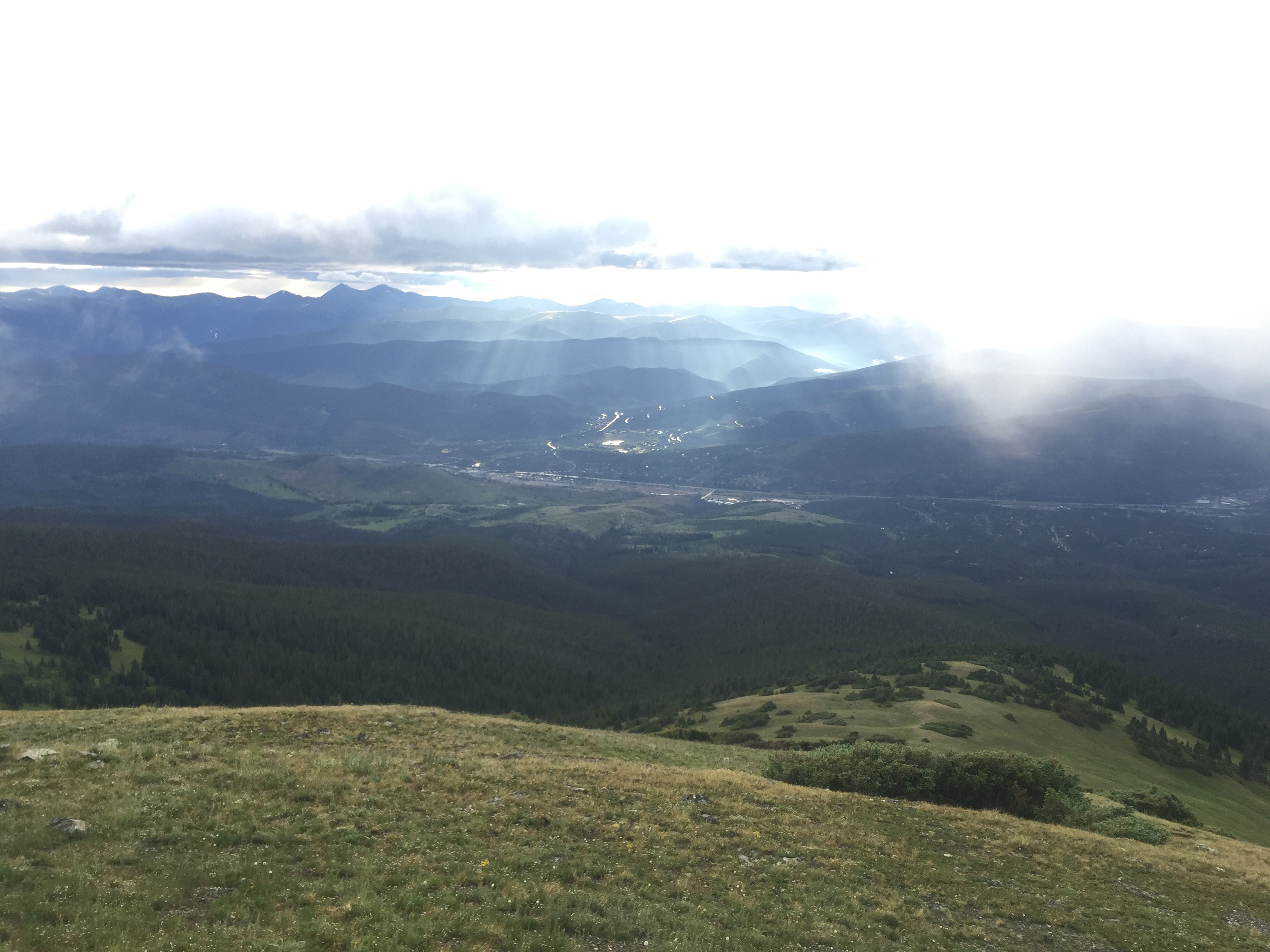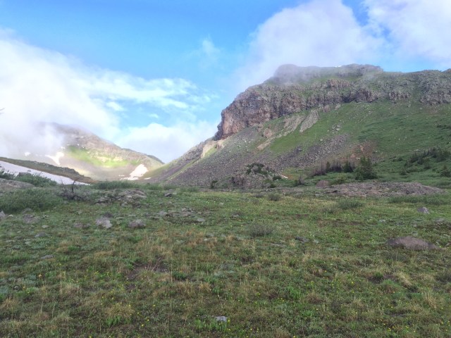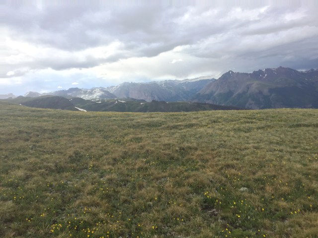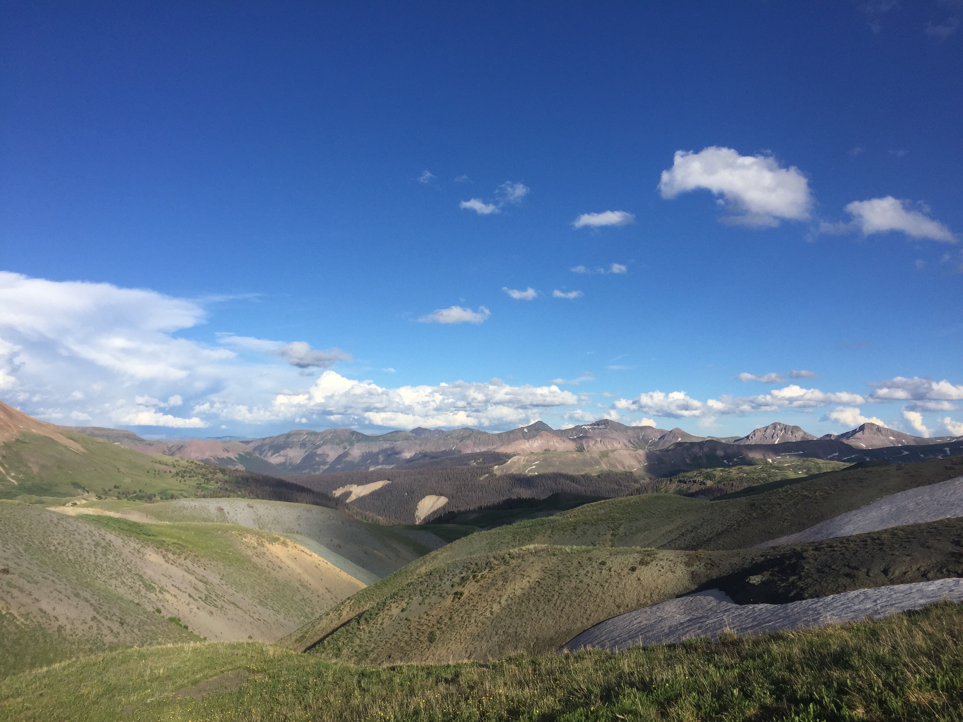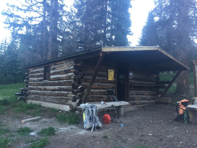 Chipmunk was gone by the time we got out of the tent in hopes of getting over the high pass before the storm. I was still disappointed to be in the trees not on the ridge for the morning hours. The trail wandered around in the forest before crossing a stream and joining a multi use trail. Many dirt bikes have ride it lately making it slippery and annoying to hike. We then began a steep uphill climb to reconnect to the divide. I had an awful headache. We saw some elk and heard coyotes howling in the distance. Even though it wasn’t the official trail it was pretty. We reconnected to the trail and met some divide bike riders. Those guys are crazy since they ride on the edge of cliffs on loose rock. I wouldn’t do that! We connected to a road which would led to the next big pass. We hurried along as the clouds were building and it was around noon. We decided to check out an old log building near a mining site for lunch. Within ten minutes of arriving the storm came roaring in. This old building has lots of holes in the roof and a few marmots likely live here as well. We both cooked food and watched the storm move in through the old window or hole in the log walls. As it started to pour, it was tough to find a dry spot as I decided to lay down under my polycro. It was quite he storm and we spent about two hours hunkered down. I was chilly and the sky was looking better so we took our change. We later found out Chipmunk was up there during the worst part and it even hailed on her. The trail continued on the steep rocky road as I quickly warmed up. Just kept watching the dark sky! We joined a trail again switch backing up higher and higher well above 13,000 feet. We found the highest point of the Colorado Trail and continued walking the ridge line hoping for no lightning strikes. I forget to mention Happy 4th of July! Third year in a row of living in the mountains during this holiday. What more could a girl ask for? The clouds broke up and the views were stunning! I’d say it was better then any fireworks display! We cruised along walking super fast to get lower in elevation. We dipped down and headed back into the woods where we set up camp alongside Chipmunk. There is a yurt that can be rented across the meadow from us and one of their dogs ran over and got some love from us. The dog tried to get into her tent. I thought we had a new pet, but then owner called her back. Tomorrow morning we will get into town and we just survived the San Juans! This section of trail was by far the most challenging so far. From the long food carry, steep climbs, intense daily storms, but the beauty was unbelievable. I will be back to play around some more in the San Juans!