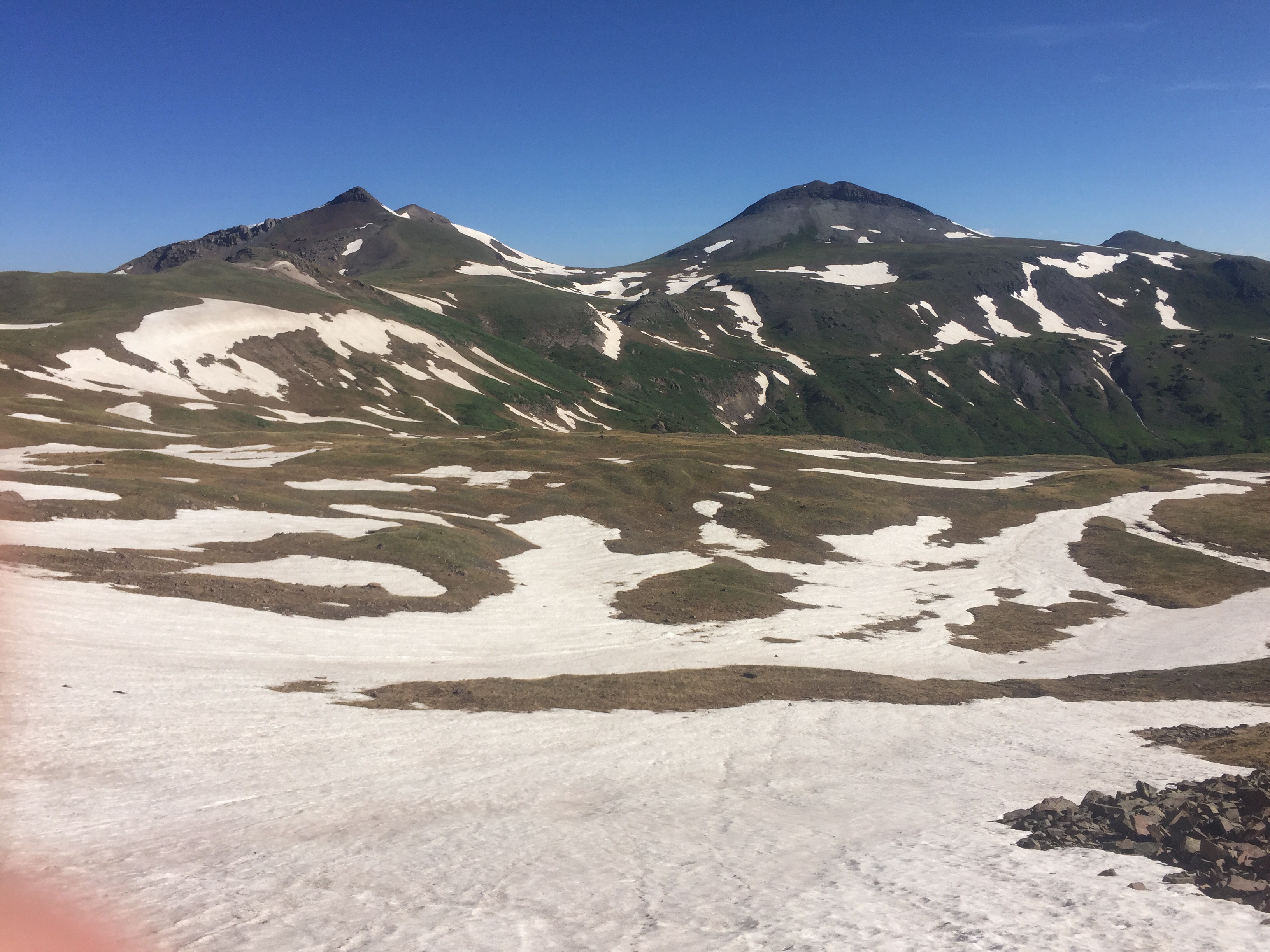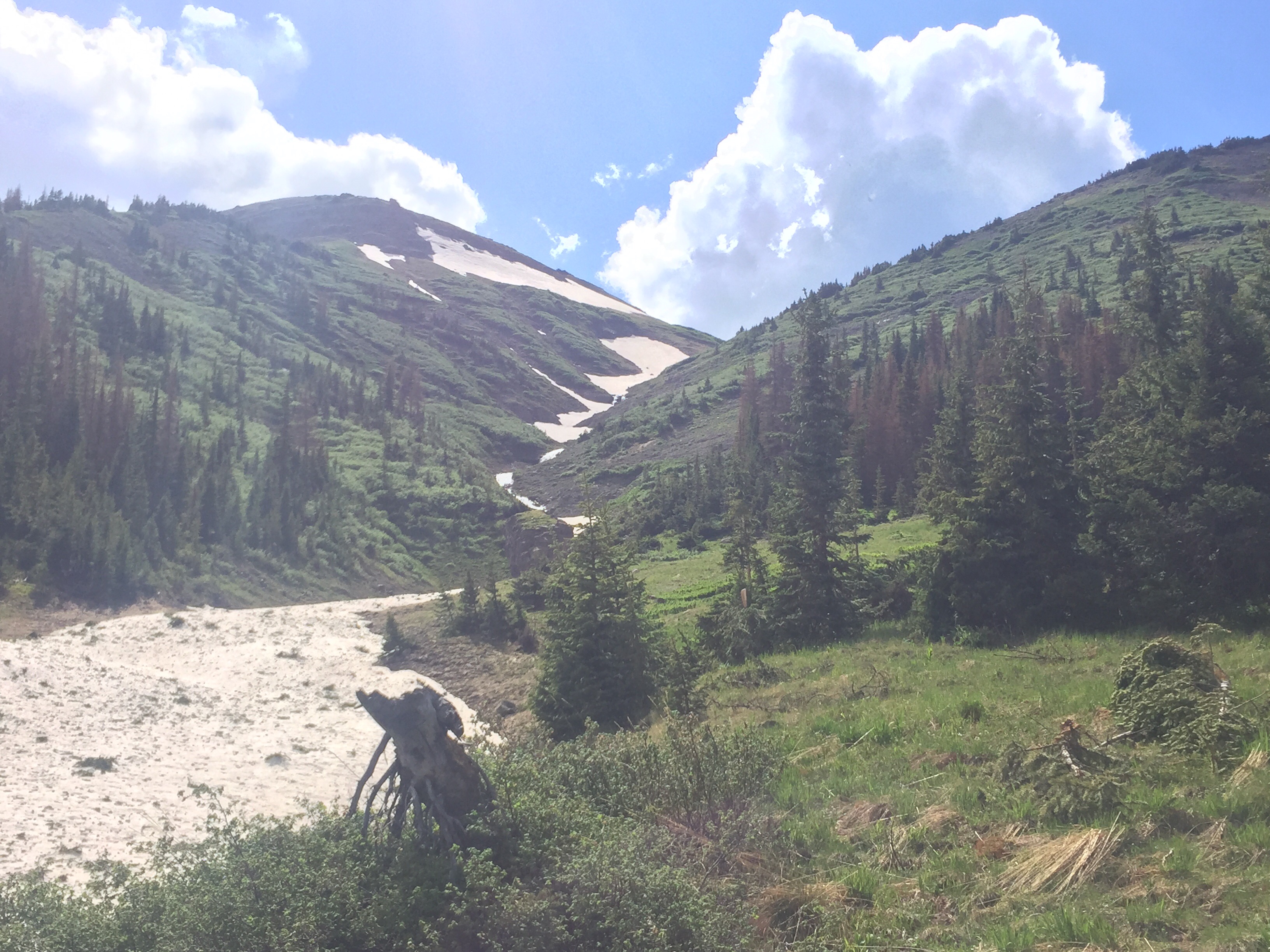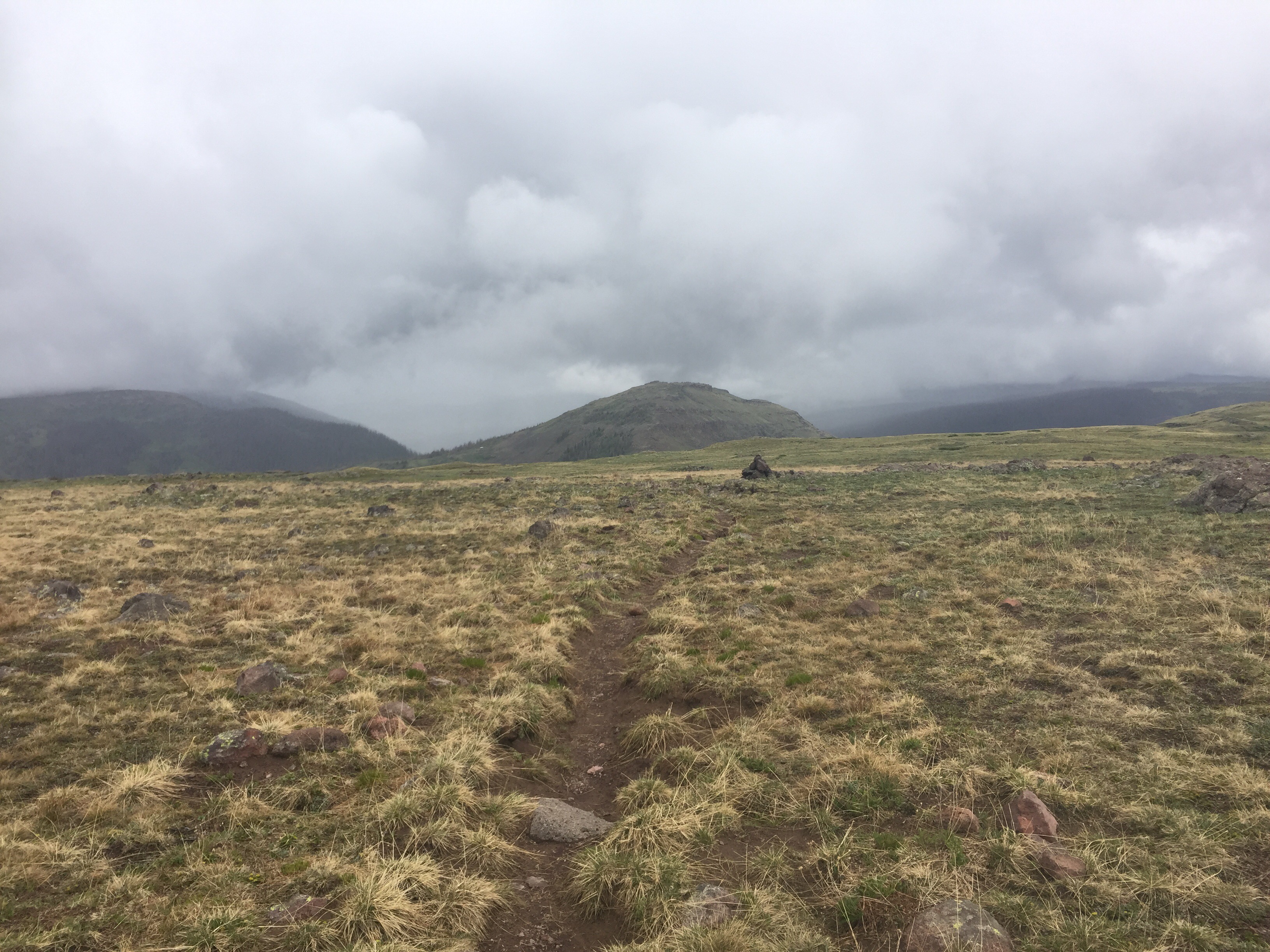 Another beautiful morning hike walking above the tree line most of the time before dipping down to climb back up. Lots of marmot, pika, and elk everywhere. We spent most of the day staring up at the sky waiting for a storm to strike. We put in some good miles before the cold rain and thunder storm hit. We jumped over a huge snow drift and into the trees. We waited an hour shivering next to each other getting slightly wet as hail bounced down as well. So cold for the end of June! We had to keep moving knowing we couldn’t sleep here. The sky is tricky to decipher and we are usually wrong. We began the ridge walk along the actual divide as the clouds grew darker. Chipmunk emerged from a side trail where she had been hiding during the thunder. We zoomed as fast as we could along the rocky terrain having to get over this section. The rain turned to hail that bounced off of us. Painful! We walked in the storm for a while before deciding it was too risky so we bailed down the side of the ridge towards a patch of trees. The three of us huddled together as hail and snow turned the ground into a wet and messy slush. We debated our options and decided to call it for the day. We found flat terrain a little ways away and set up our tents on top of the hail. So glad I’m using a blow up sleeping pad this year and sharing a tent. I changed into dry clothes and got into my sleeping bag quickly. We were both too cold to cook so we just smacked and cuddled to keep warm. What a wild day in the San Juans. Today is the last day of June… Let’s hope that July is warmer.