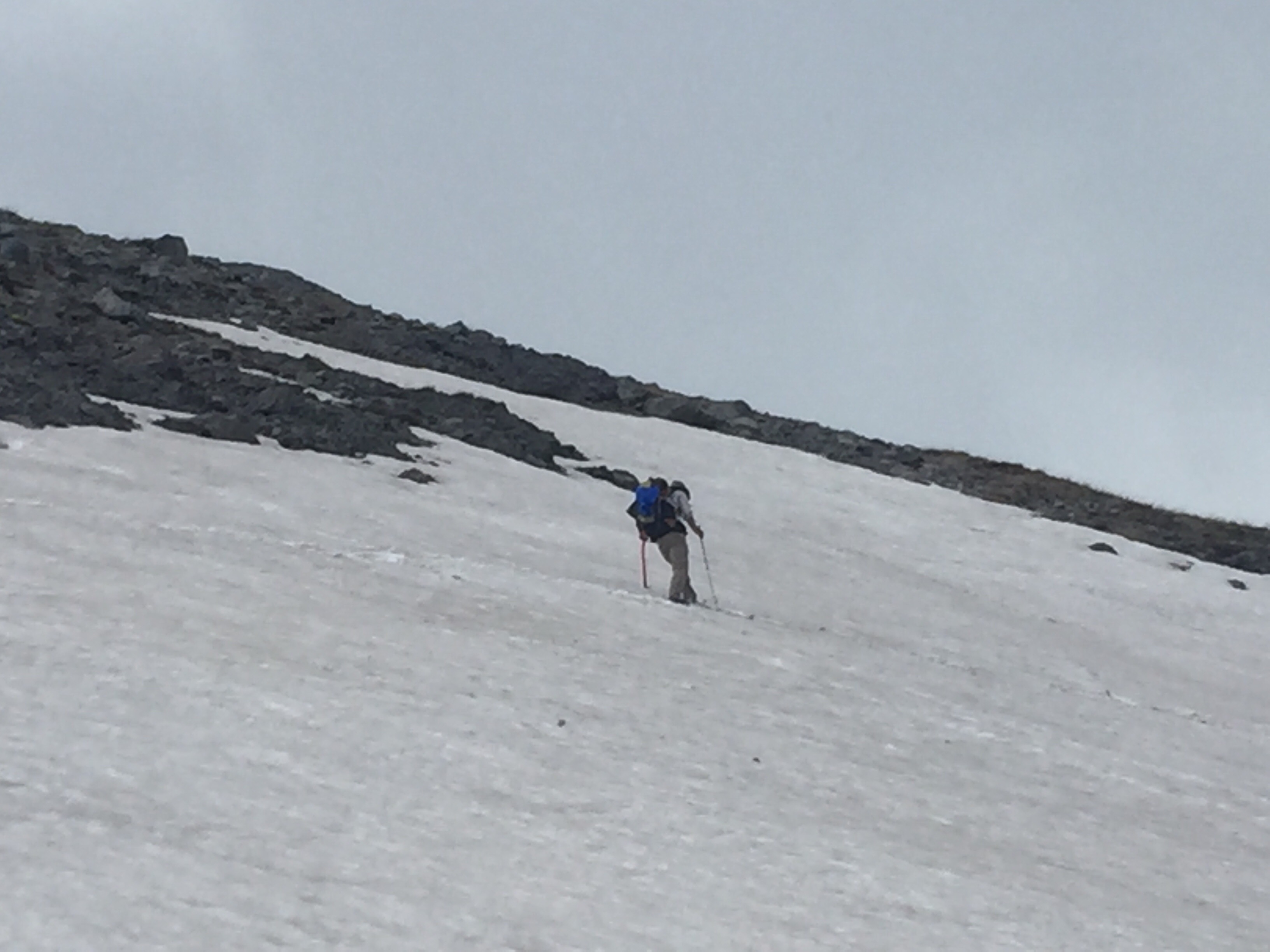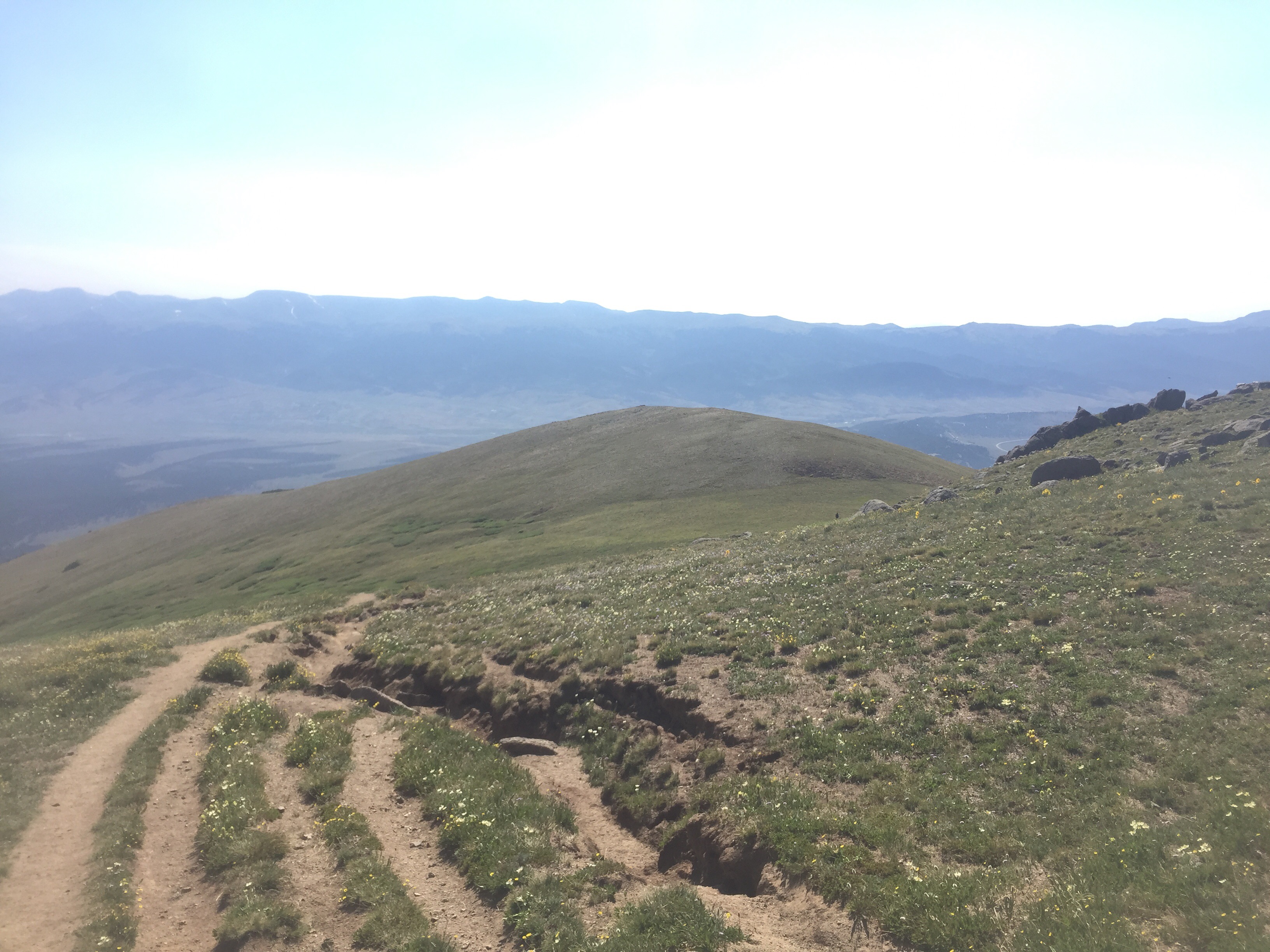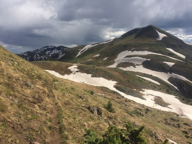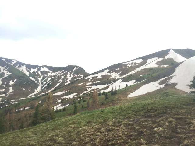 Another beautiful morning hike walking above the tree line most of the time before dipping down to climb back up. Lots of marmot, pika, and elk everywhere. We spent most of the day staring up at the sky waiting for a storm to strike. We put in some good miles before the cold rain and thunder storm hit. We jumped over a huge snow drift and into the trees. We waited an hour shivering next to each other getting slightly wet as hail bounced down as well. So cold for the end of June! We had to keep moving knowing we couldn’t sleep here. The sky is tricky to decipher and we are usually wrong. We began the ridge walk along the actual divide as the clouds grew darker. Chipmunk emerged from a side trail where she had been hiding during the thunder. We zoomed as fast as we could along the rocky terrain having to get over this section. The rain turned to hail that bounced off of us. Painful! We walked in the storm for a while before deciding it was too risky so we bailed down the side of the ridge towards a patch of trees. The three of us huddled together as hail and snow turned the ground into a wet and messy slush. We debated our options and decided to call it for the day. We found flat terrain a little ways away and set up our tents on top of the hail. So glad I’m using a blow up sleeping pad this year and sharing a tent. I changed into dry clothes and got into my sleeping bag quickly. We were both too cold to cook so we just smacked and cuddled to keep warm. What a wild day in the San Juans. Today is the last day of June… Let’s hope that July is warmer.
