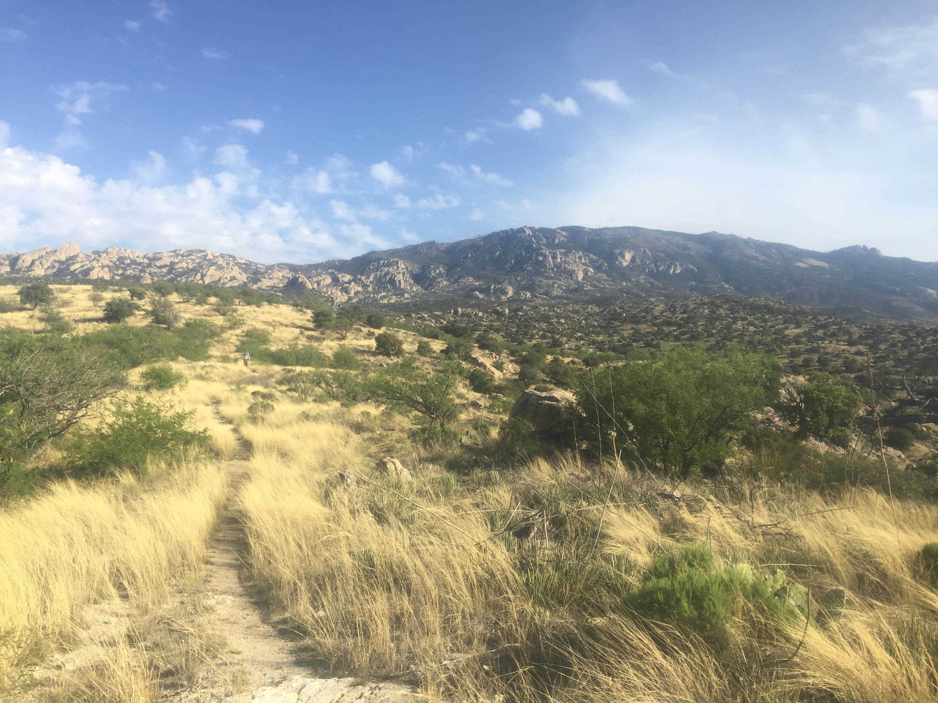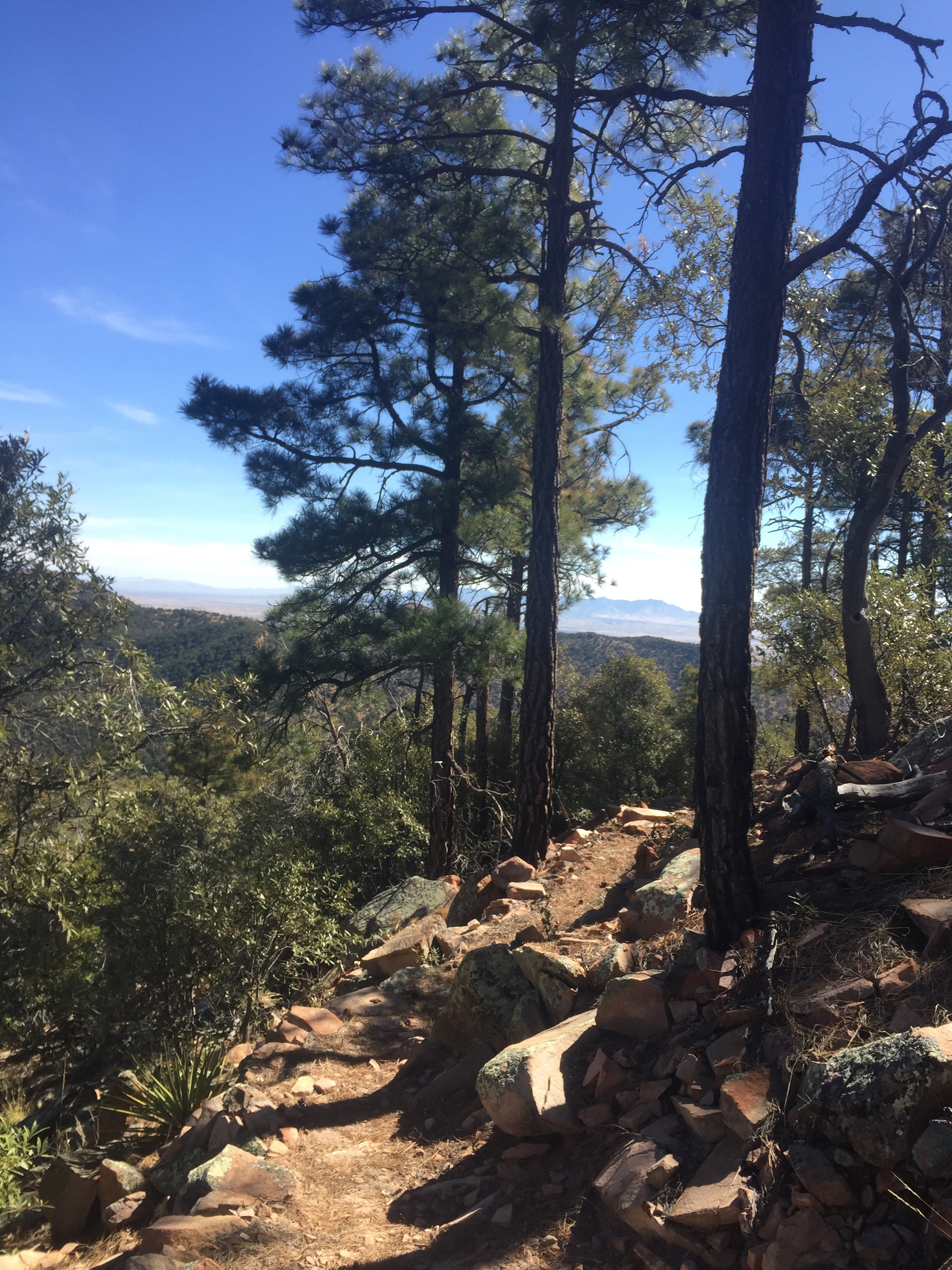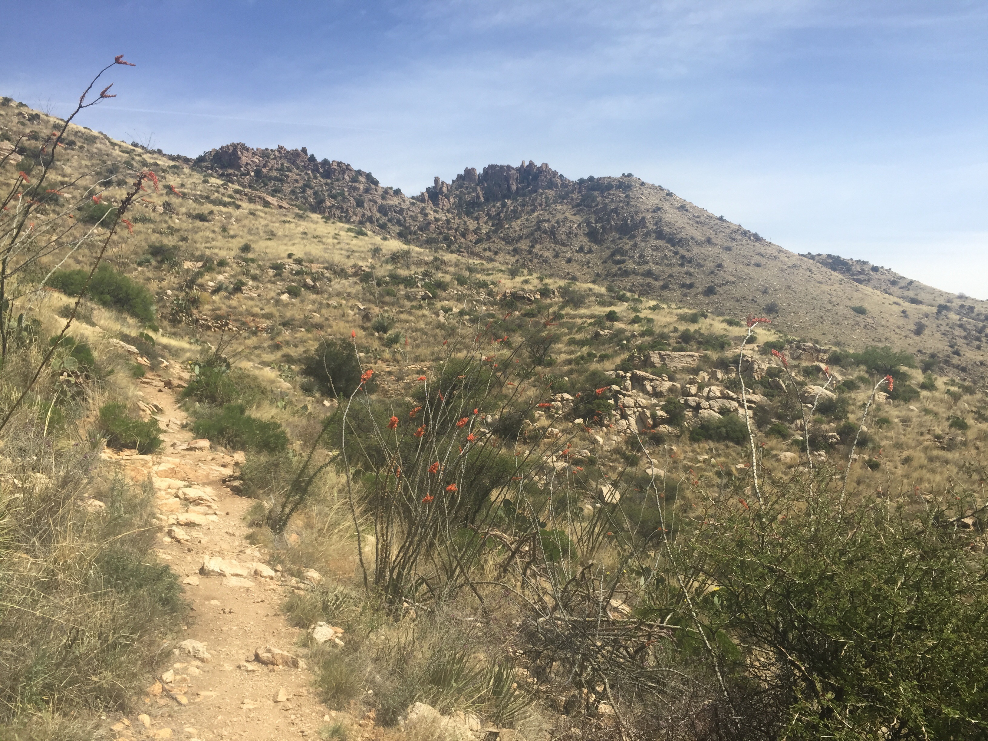 The trail has been easy walking today as we even hit a 3 mile per hour pace for a bit. I’m back to my trusty pair of Salomon trail runners in hopes my feet return to normal. We hiked together most of the day chatting away the miles! We can still see Mt Lemmon and know where Summerhaven is from a distance. This trail has been gorgeous each day. We saw dozens of bunnies today and lots of birds singing. We also spotted a strange red and yellow snake that quickly slithered away before we took take a picture.