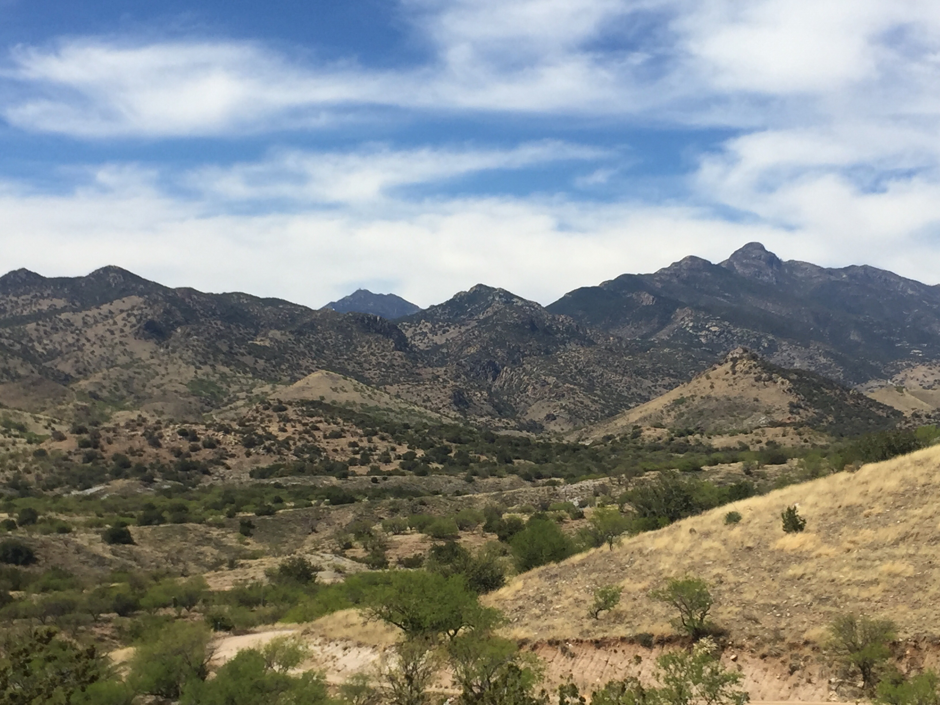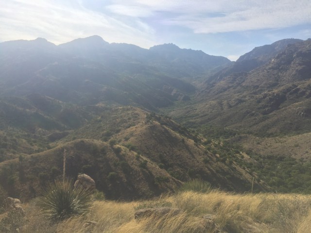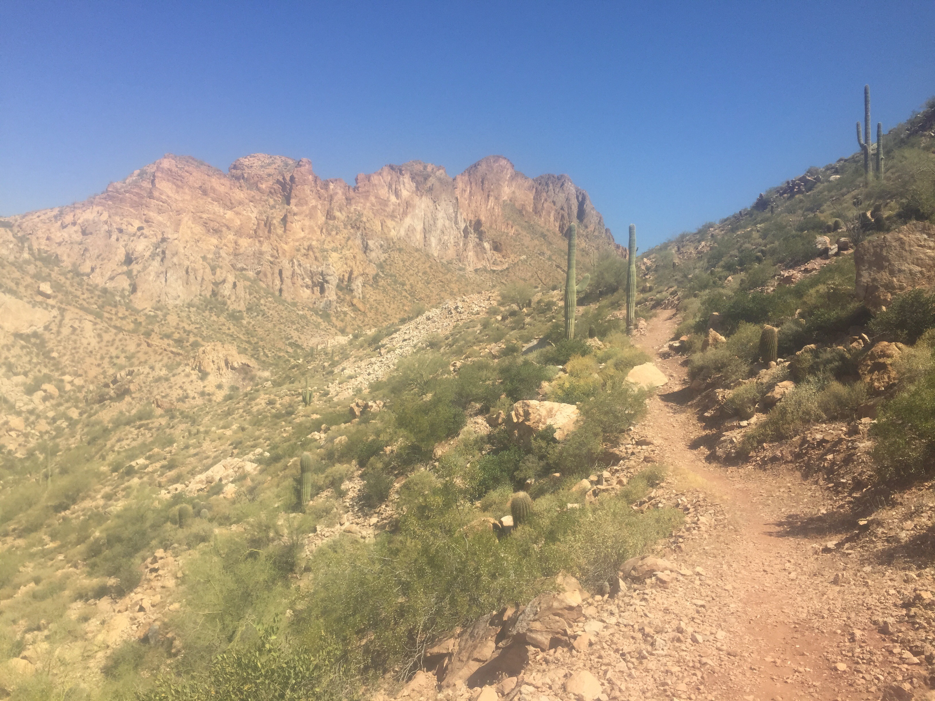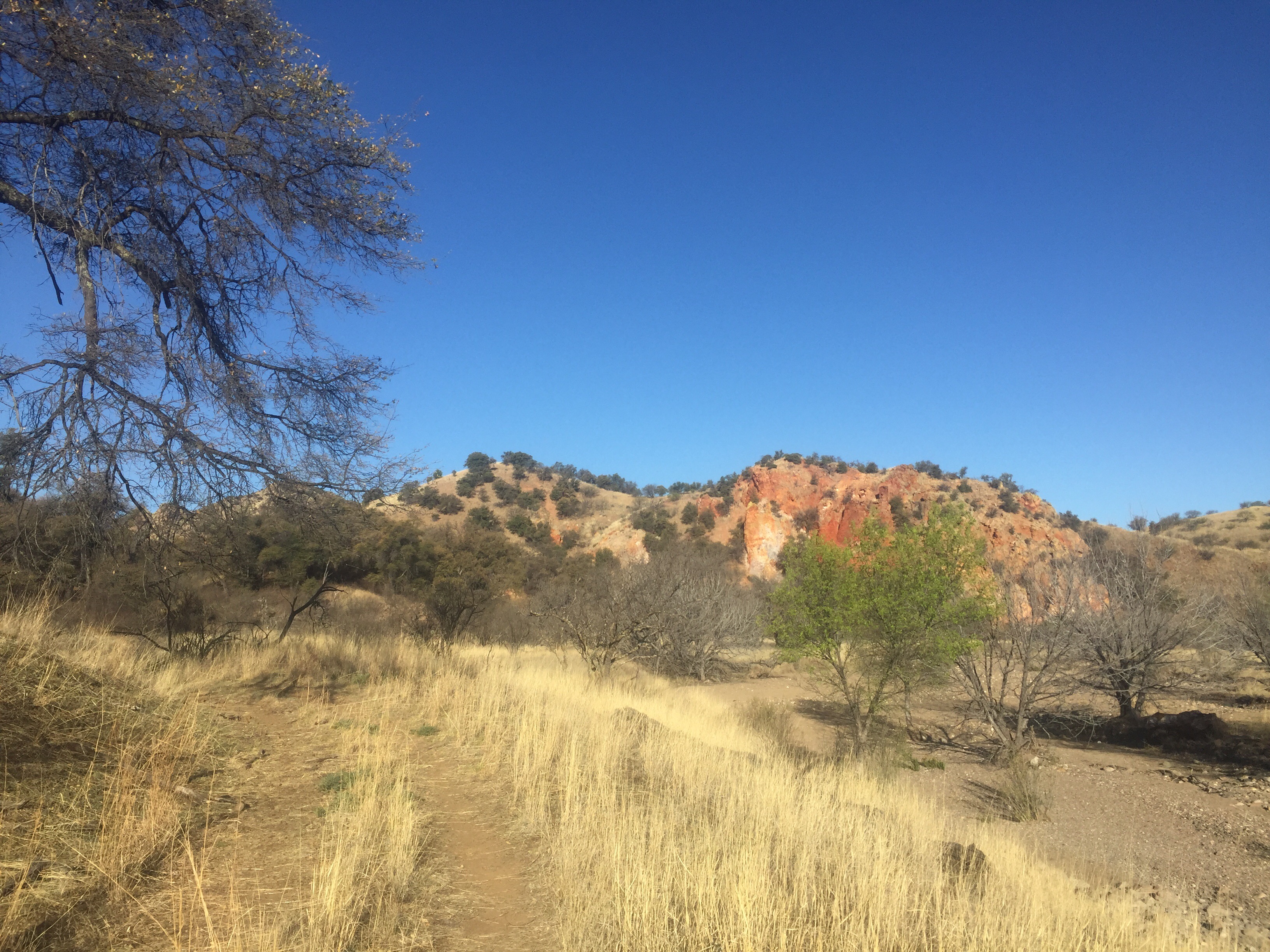 The trail has been easy walking today as we even hit a 3 mile per hour pace for a bit. I’m back to my trusty pair of Salomon trail runners in hopes my feet return to normal. We hiked together most of the day chatting away the miles! We can still see Mt Lemmon and know where Summerhaven is from a distance. This trail has been gorgeous each day. We saw dozens of bunnies today and lots of birds singing. We also spotted a strange red and yellow snake that quickly slithered away before we took take a picture.