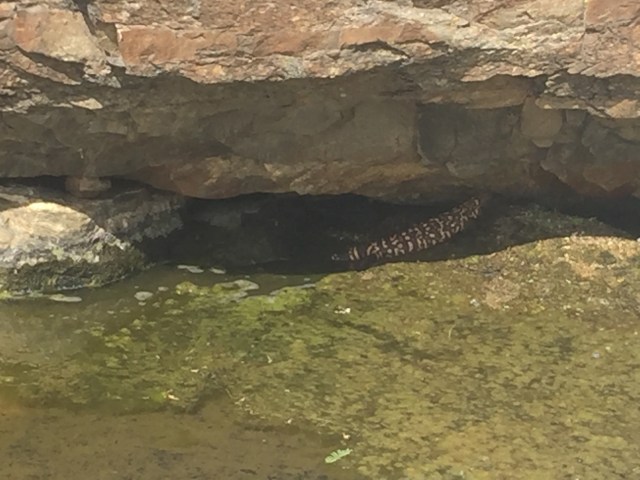I ate my last slice of pizza for breakfast before we started hiking. Then we were off into the low desert near the Gila River. The Gila River is very silty here and the trail does not walk along it or cross it once. As we were nearing our last access to the river, I came across a sad sight. A small Gila Monster was dead on the trail. It had a wound to its head as if it had stepped on or rode over by a bike. It was the smallest one I’ve seen it. Poor thing!