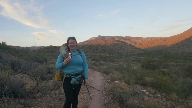 At 7 o’clock, I threw off my pack and climbed on a huge rock to lie down. We both put on our headlamps and walked together surrounded by saguaros as the sun dipped behind the mountains. At 20.8 miles, we came to a large sandy wash where we quickly put up our tent then feasted on a pizza dinner. Delicious!! Without a rain fly, we tried to cool off inside the tent. I will not tell you what I wore to bed if anything. It was a toasty night and we were stilly sweaty from hiking. What a fun day full of delicious food and beauty. We can take a 4 hour break and still do over 20 miles!