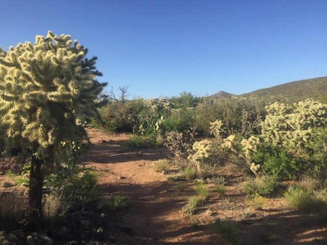 We got another early morning start before the sun rose. You can tell very early how warm it will be each day. We enjoyed a well groomed trail that even had a little footbridge over a currently dry wash. The trail went up and down some old dirt roads so we could walk together. I listened to a few podcasts as the miles zipped by.