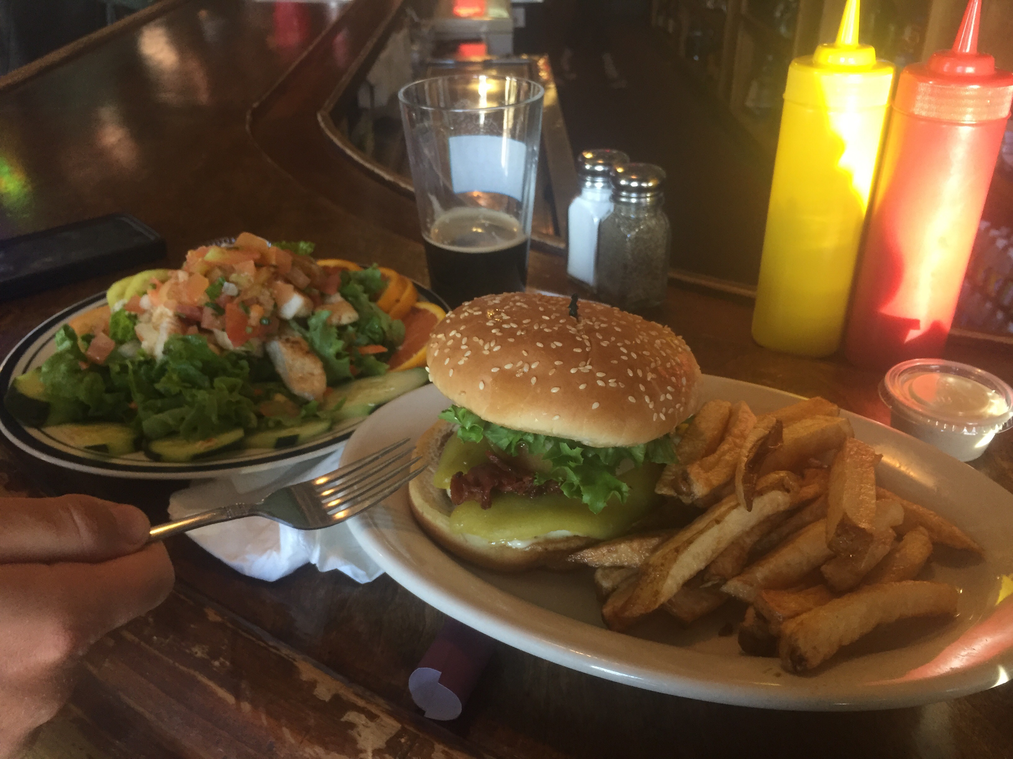 He dropped us off at Casa Denogean around 10:30 where we ordered soda, water, and breakfast for under $8 a piece including a tip. The food was delicious! We walked a short distance to the Copper Mountain Hotel where the manager told us our room will not be ready until after two. Well that sucks. She let us leave our backpacks and things in the storage closet so we could go downtown and run some errands. We walked through a few neighborhoods and past lots of angry dogs. My plan had been to go to the library and relax from the heat to kill three hours. But the library was not open, so we went to a restaurant called Porter café. We sat at the bar enjoy the beer before ordering another meal an hour or so after eating breakfast. Our plan was to eat some of it and have the rest for dinner. But I guess hiker hunger has hit, as we both finished our meals. We split a chicken salad and the best burger yet.
