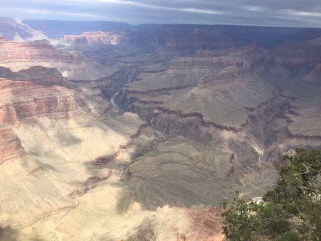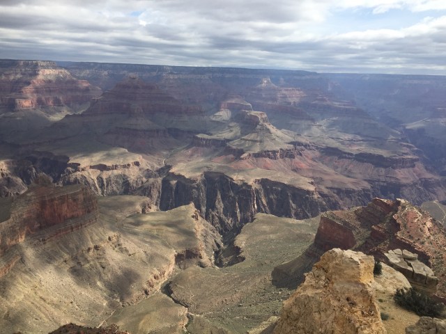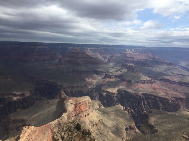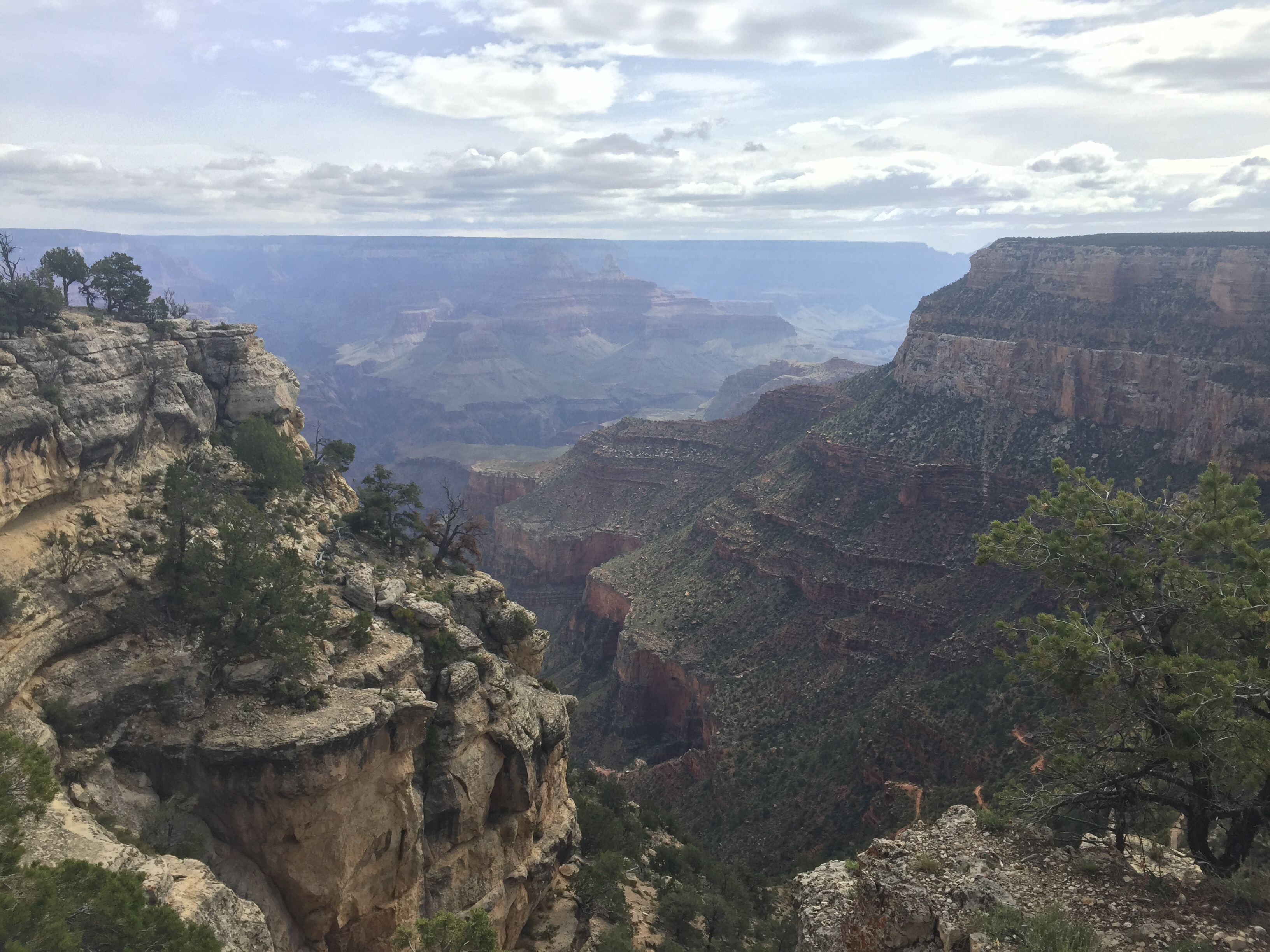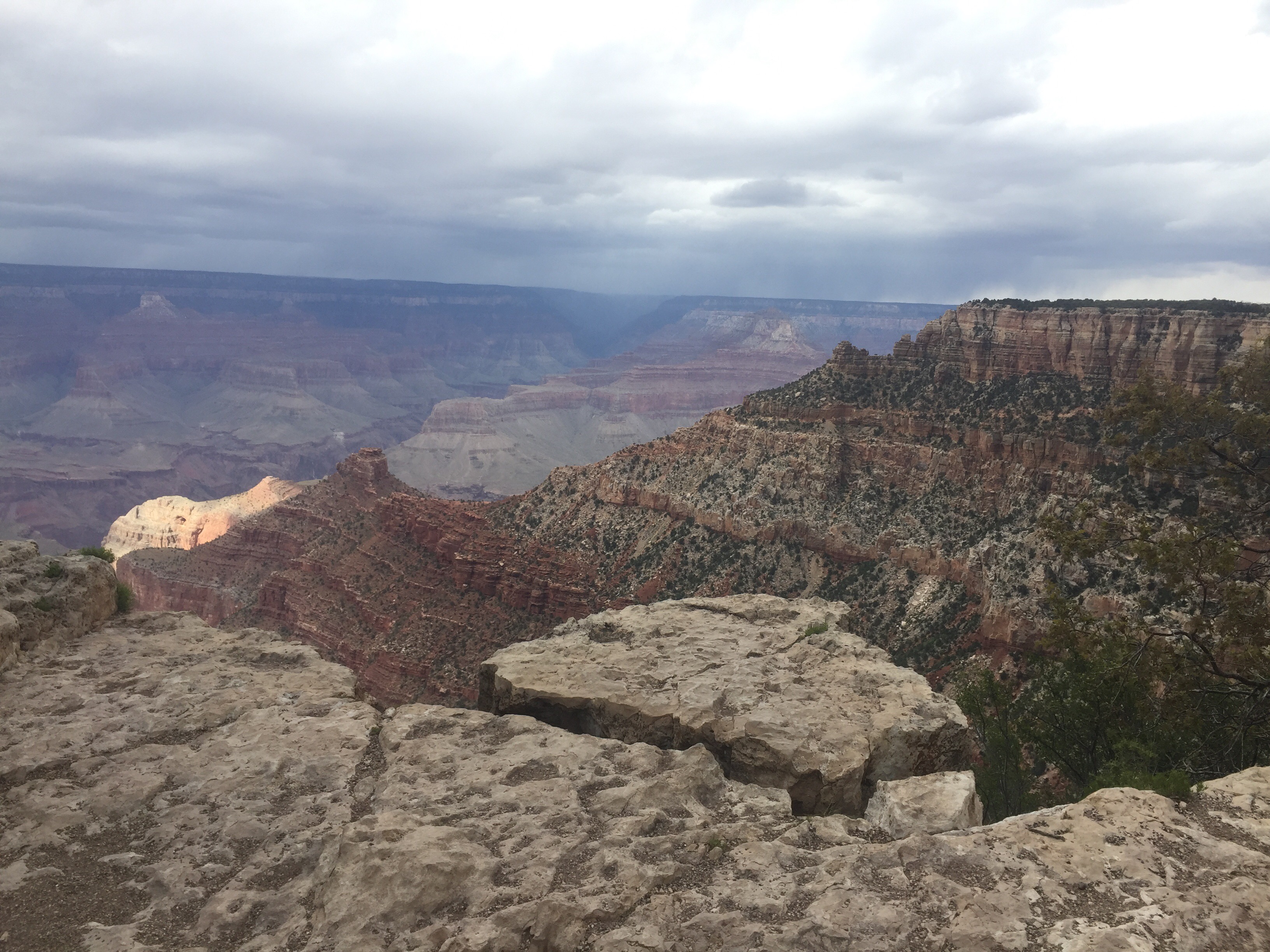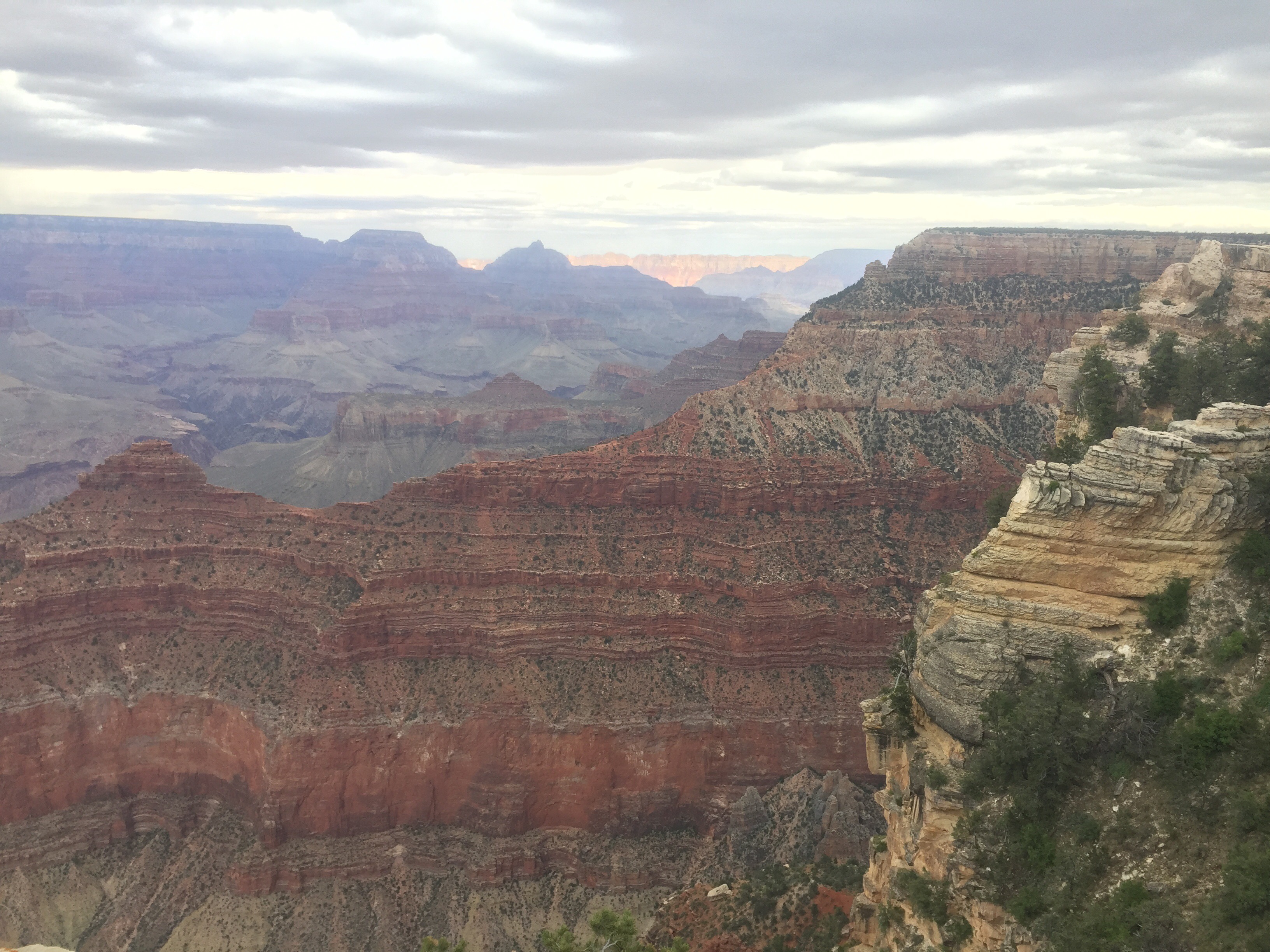 We began hiking eastbound on the rim trail from where we got off the shuttle. The sky was dark, but the weather would hold out for a bit longer. It was wonderful to have this time to walk together along the paved trail. We stopped at a visitor center, the historic Hopi House, and stopped to read all the signs along the way. Lots of people were rushing about some feeding chipmunks sour patch kids, kids and adults climbing off the side of the rim onto rocks, and many unhappy kids being dragged along the rim trail. We were content with light packs and views. We could see the Kaibab Trail as we headed father East as I got more excited to hike down to the bottom tomorrow.