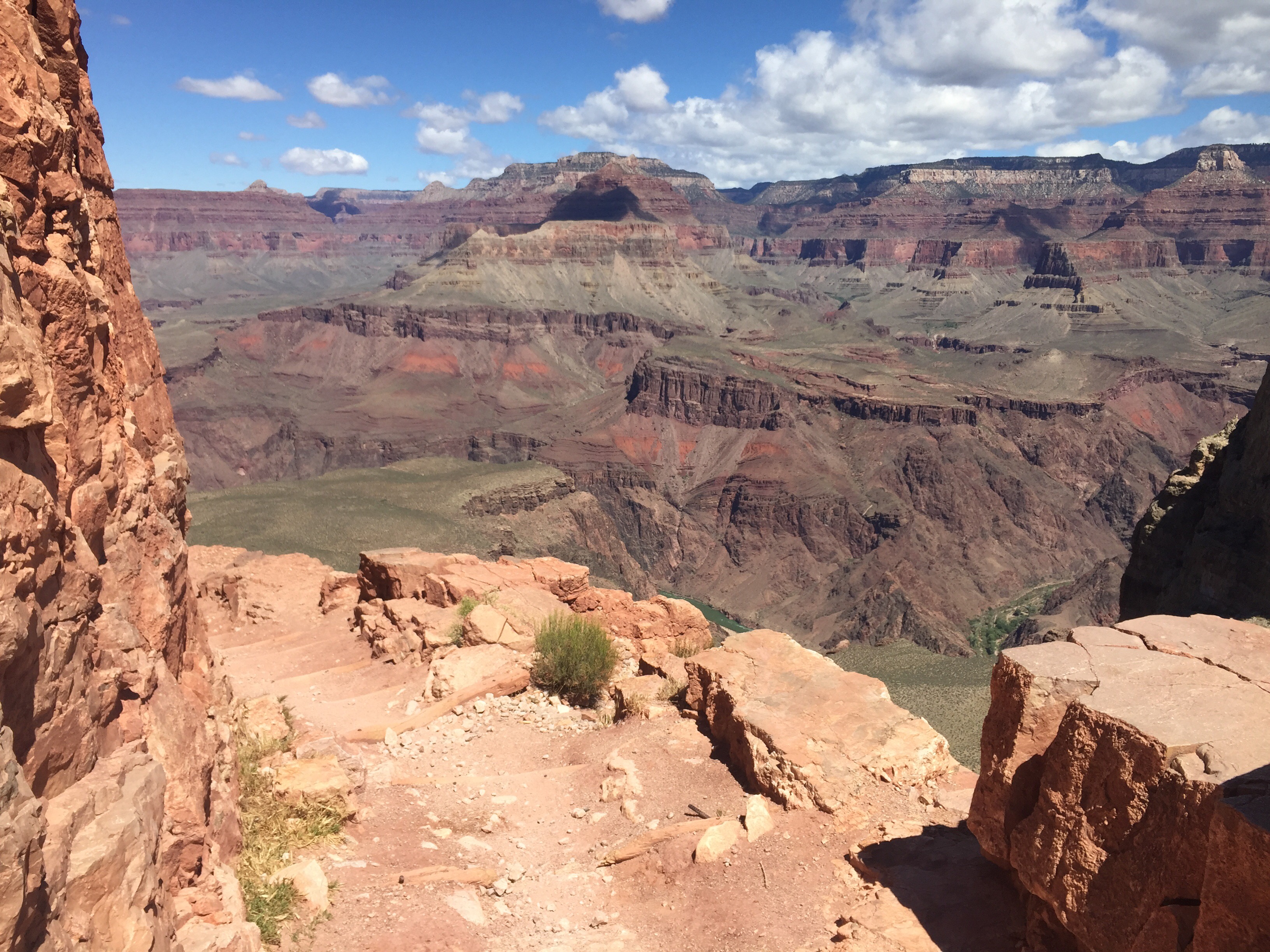 We stopped for a short break at the first bathroom since we were both super hydrated before moving along. Watching hikers climbing out the canyon exhausted had me a bit worried for tomorrow. The farther down we climbed the warmer it became, but today is actually one of the cooler days of this week. We truly have been lucky with this trail. You can see the trail far ahead of you as you twist and turn. We were making great time and decided to have a snack break with a grand view.