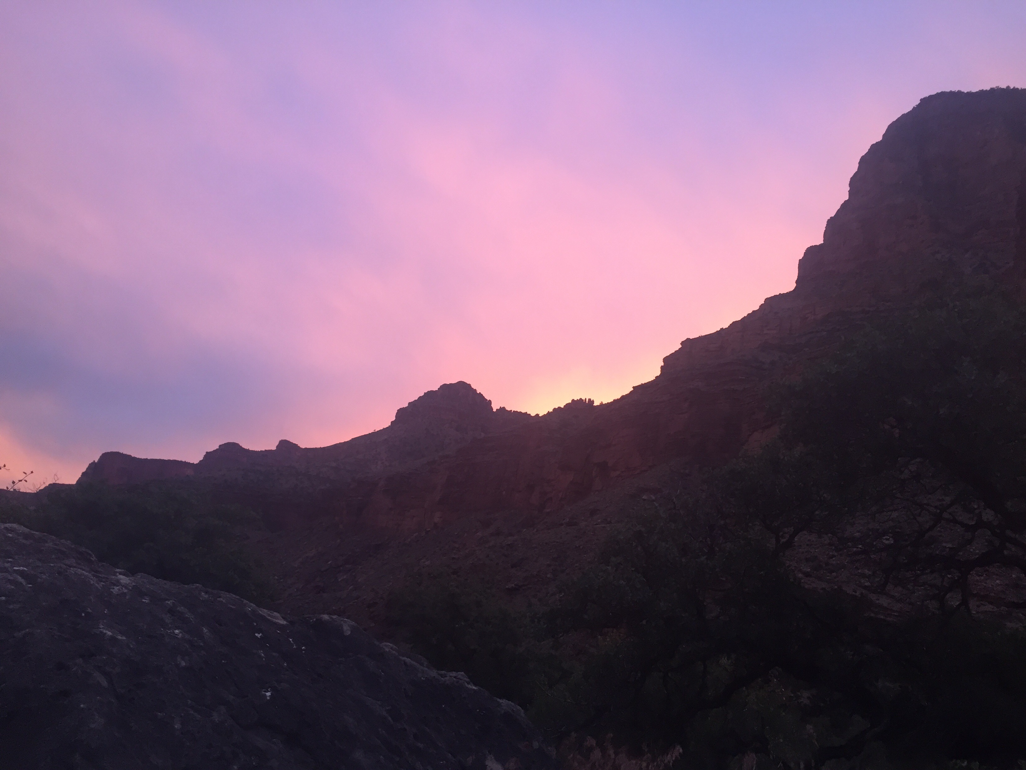 The weather was still nice and lots of runners going Rim to rim in a day zoomed by us. We had fun walking along flowing water and staring up at the massive canyon walls. We gradually climbed up 1,638 feet to Cottonwood Campground. We passed all of the sites until we found the last one labeled “stock only.” It was a large site with a picnic table and food storage containers just like all of the other spots. We set up quickly as dark clouds were threatening. I cooked a huge portion of broccoli cheddar soup as it began to sprinkle. I sat at the table with my umbrella as he relaxed inside of the tent. The drizzle didn’t last too long, but I still climbed into the tent to relax. We were rewarded with a colorful sunset to finish off our beautiful day of hiking. Only love!