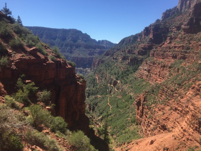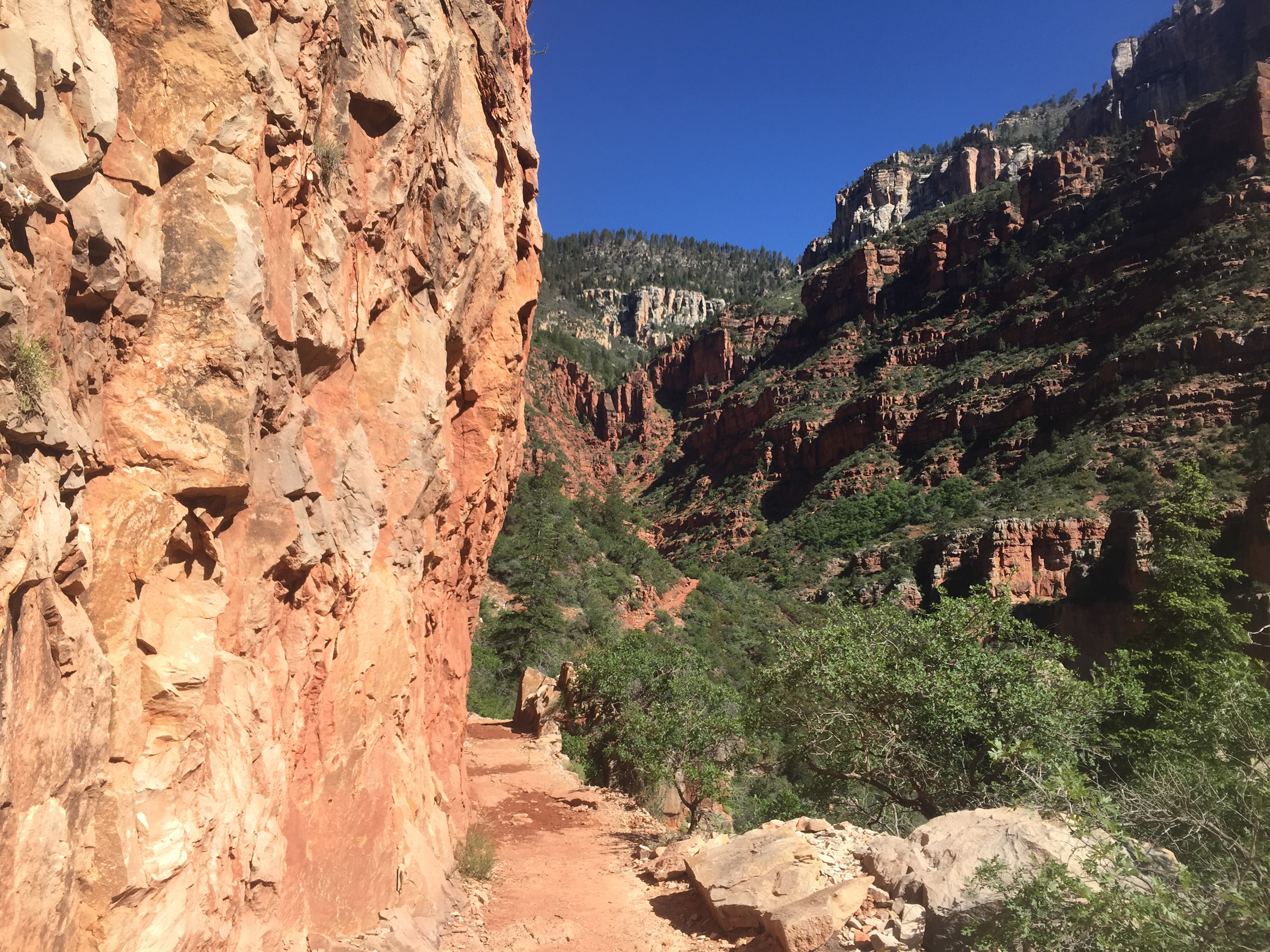 We were the first ones to leave the campsite this morning as the sun hadn’t yet peeked over the rim. We are 7.1 miles to the top of the North Rim and have to climb 4,171 feet to get there. My legs are a little sore this morning from all downhill yesterday. We moved quickly to start the day and slowly begin to be ascent towards the top of the rim.