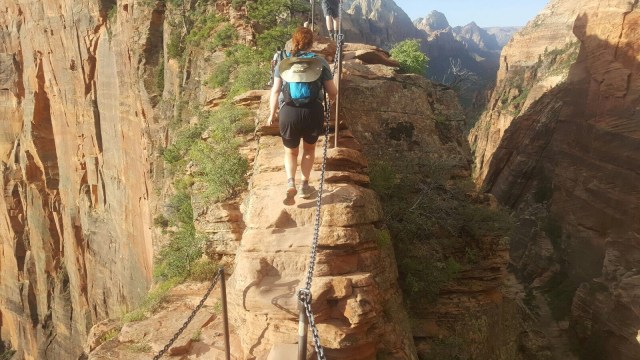 We were making great time and took a break after a foot bridge. As we smacked, we watched a NPS helicopter land on the side of the canyon dropping off two workers. This winter a large rock slide damaged the water pipe lines. We watched workers and the helicopter going back and forth between two spots. Now that is one intense job. We also thanked workers making the trail larger and repairing worn sections.